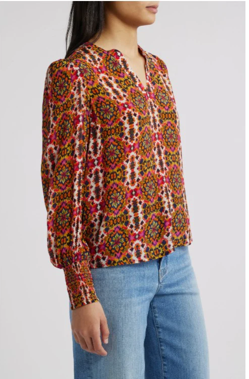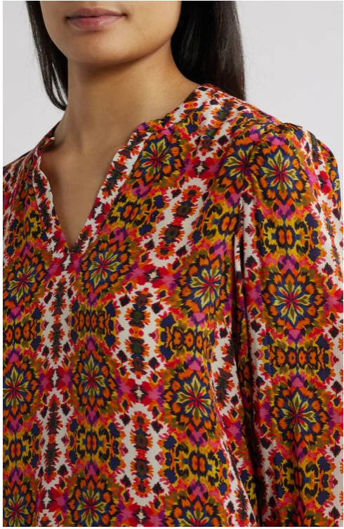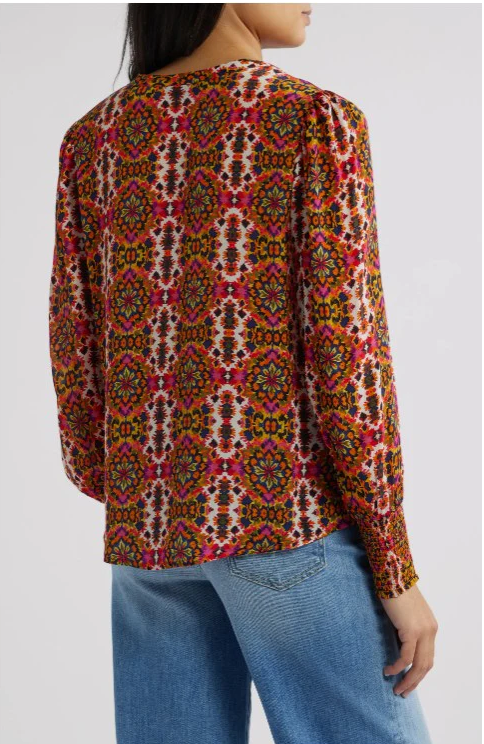 The Split Neck Kaleidoscope Blouse combines playful elegance with all-day comfort. With its flattering split neckline and smocked cuffs, this top adds fun texture and a flirty flutter to your sleeves. Crafted from a soft, breathable blend of cupro and viscose, it flows beautifully on your body. Whether you’re dressing down with jeans or stepping up with a skirt, this blouse is your new go-to for effortless style and a splash of whimsy.