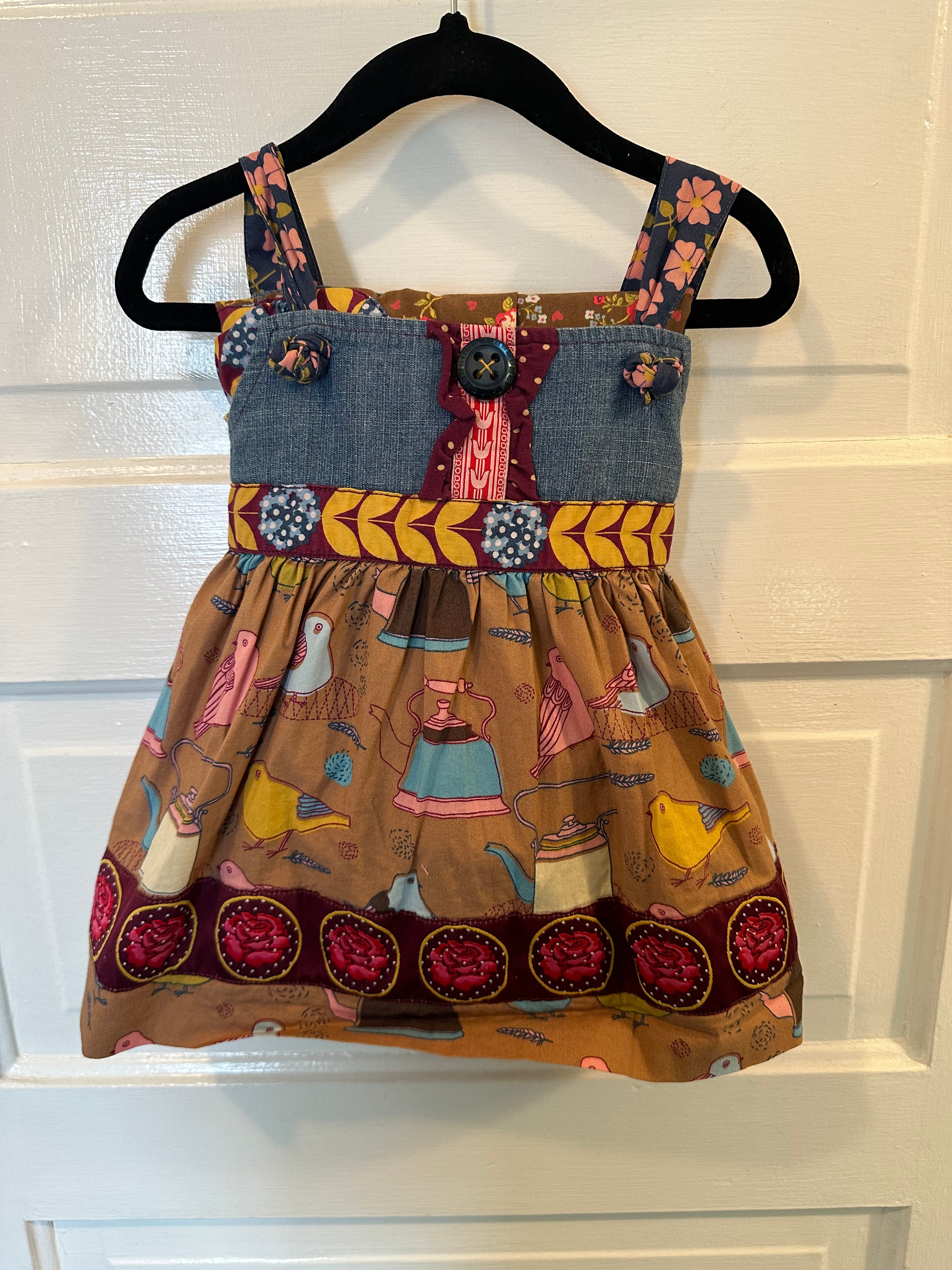 This set is for the little fashionista in your life. With adjustable straps, matching ruffle pants, and vintage fabrics paired with denim, your little one will be the trendiest kid on the block. Perfect for size 2T. (Birds and Kettles Set: a set that is both functional and stylish, just like your little one!)