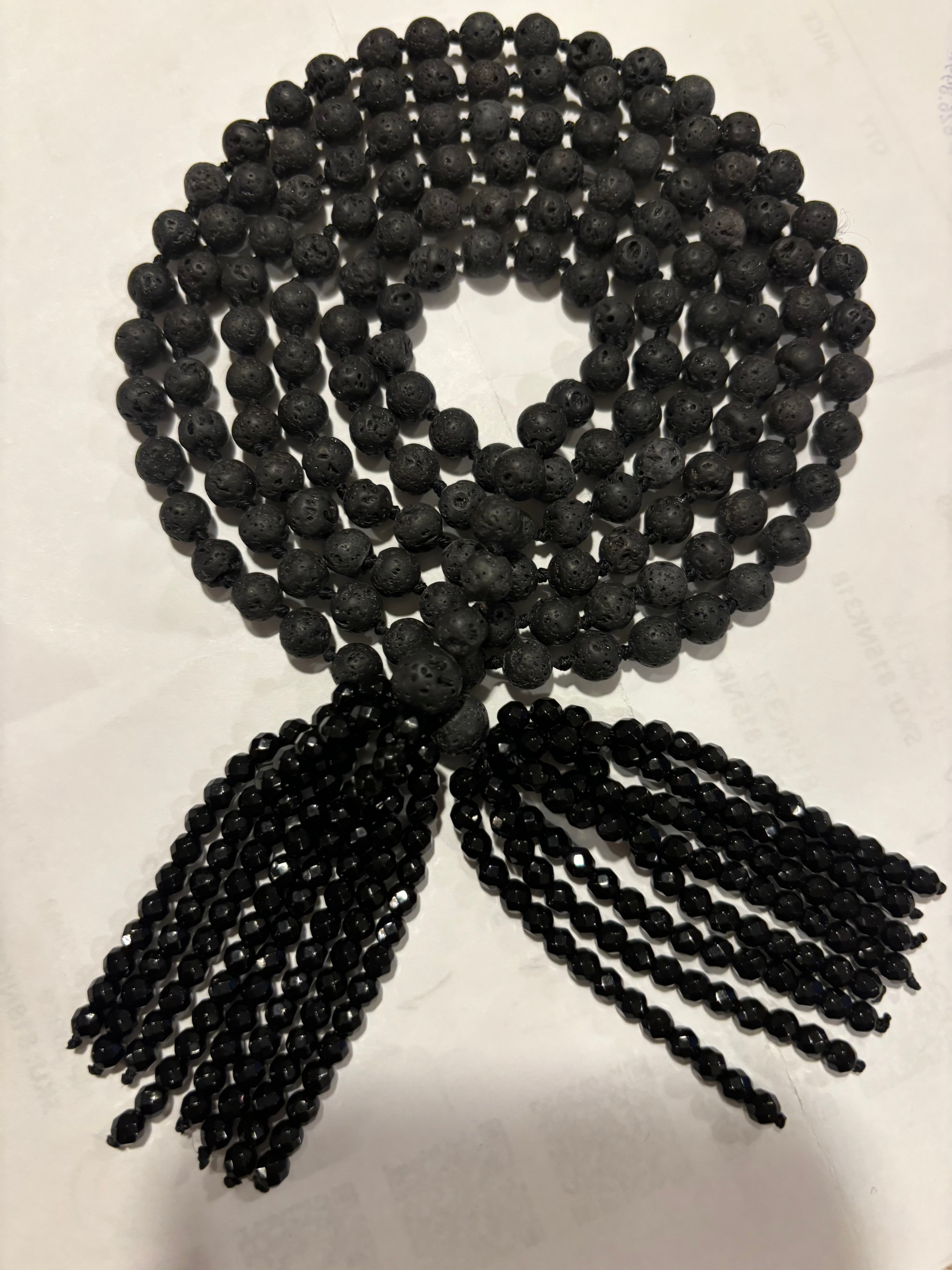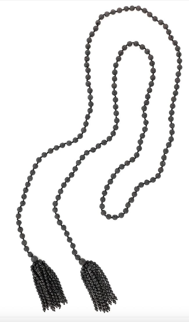 Expert Perspective: The Black Lava Lariat Necklace features 6mm black lava beads and 3mm faceted onyx beads, with a total length of 52 inches and an open closure. The tassels are made of onyx beads.