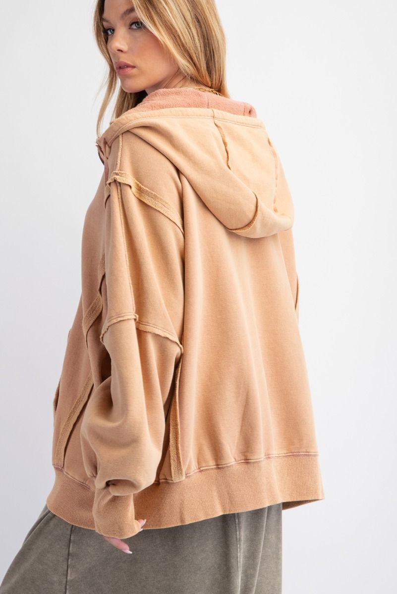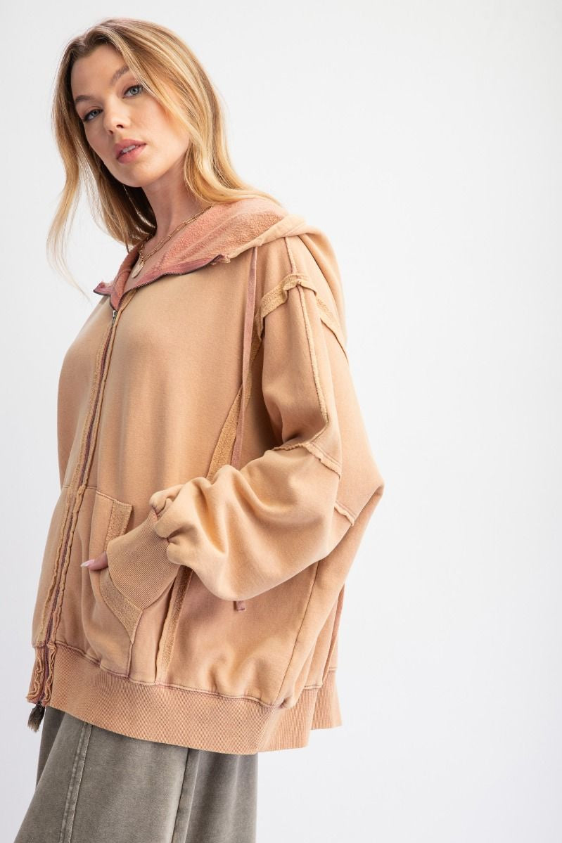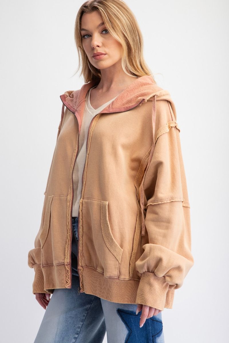 This brushed terry knit zip up hoodie is a luxurious addition to any wardrobe. The mineral washed fabric gives it a unique and sophisticated look while the adjustable tie in the hood adds functionality. With dropped shoulders, ribbed cuffs and hem, and raw cut seams, this relaxed fit jacket exudes comfort and style.