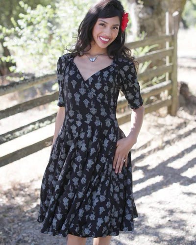 Step into charm with the Memories Dress in a whimsical cuckoo clock print. This black and pale green stretch cotton knit dress offers a playful fit-and-flare silhouette, complete with puffed shoulder sleeves and a gathered surplice bodice that flatters with a Queen Anne neckline. The full, swingy knee-length skirt moves with you, while handy pockets add a fun, practical touch. Comfortable and stylish, it’s perfect for making memories wherever you go.