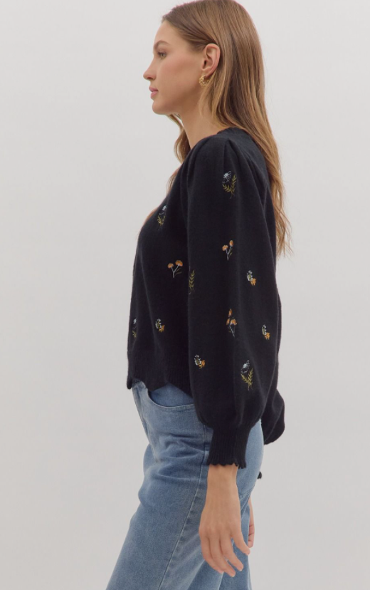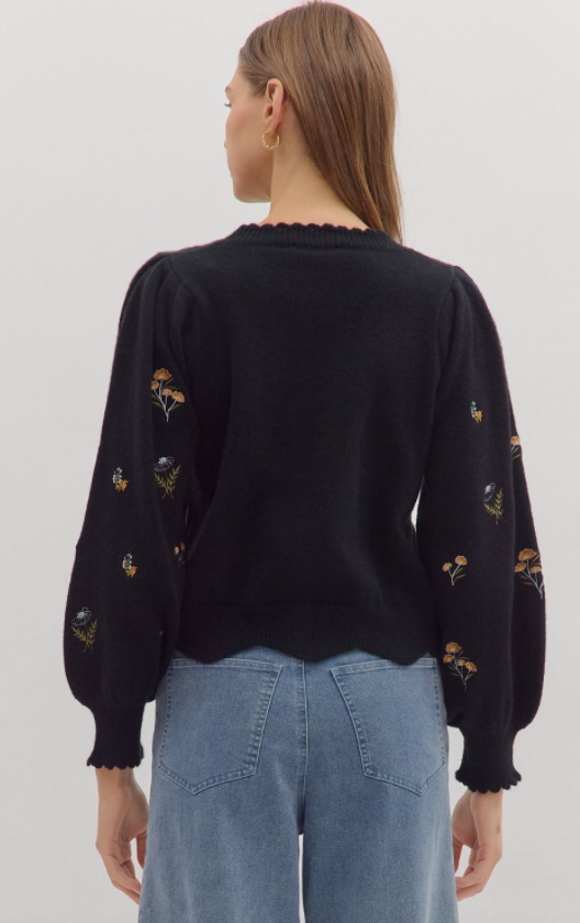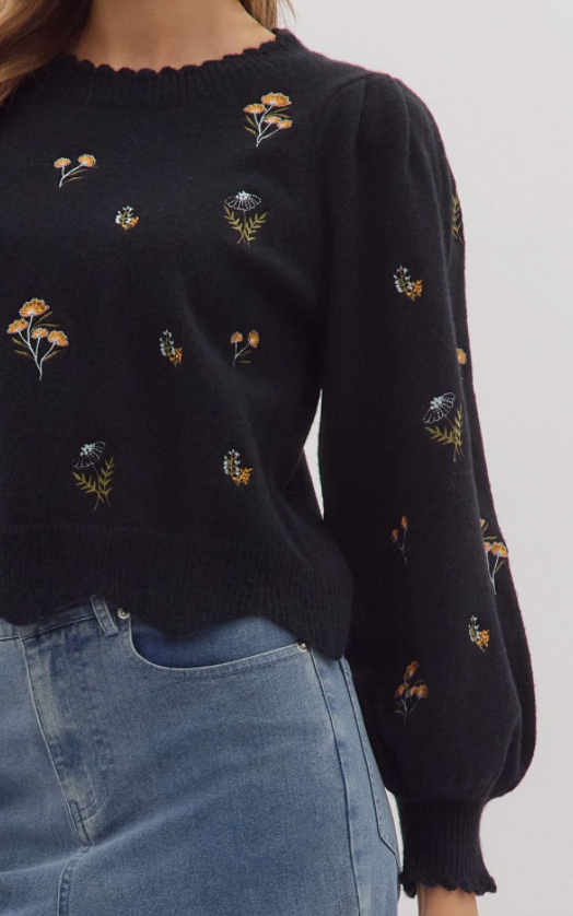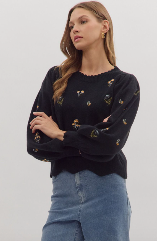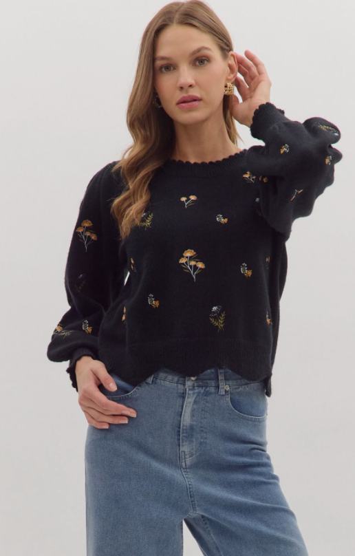 Cozy up in this playful embroidered floral sweater featuring a charming scallop hem and a comfortable round neck. Crafted from a medium-weight knit blend, it’s perfect for everyday fun without feeling bulky. The non-sheer fabric keeps you covered while adding just the right touch of texture. Unlined and easy to wear, this sweater is a delightful way to brighten your wardrobe!