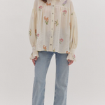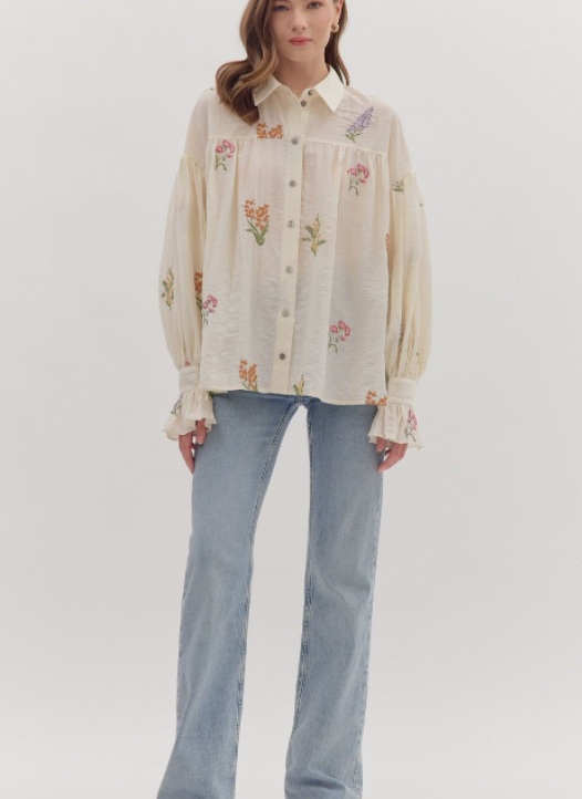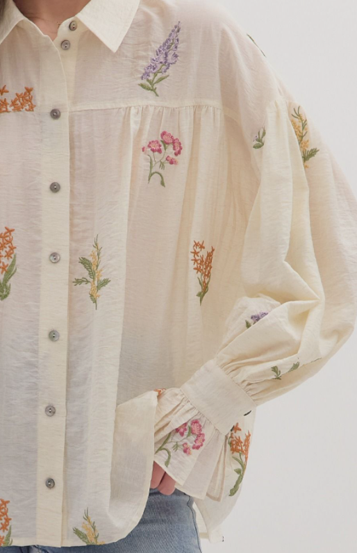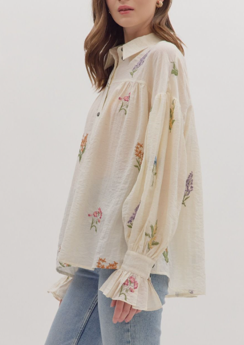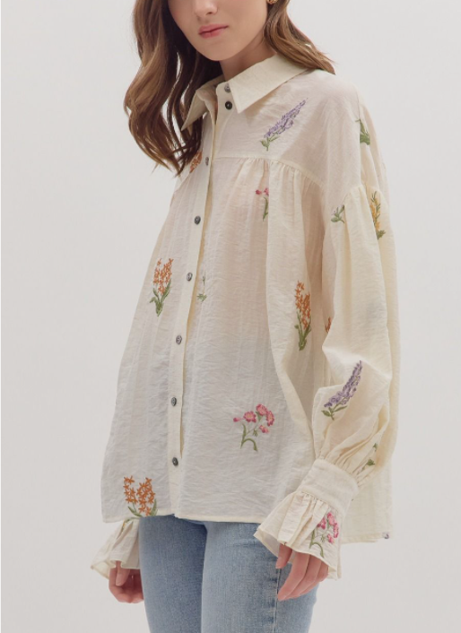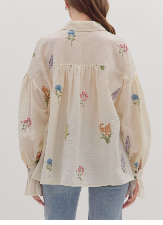 This embroidered botanical blouse brings a fresh, playful vibe to your wardrobe with delicate floral details and charming button closures down the front. Lightweight and semi-sheer, it’s lined for comfort and features ruffle cuffs that add a fun, flirty touch to your look. Crafted from a breathable blend of rayon, nylon, and linen, this woven top is perfect for breezy days and easy layering