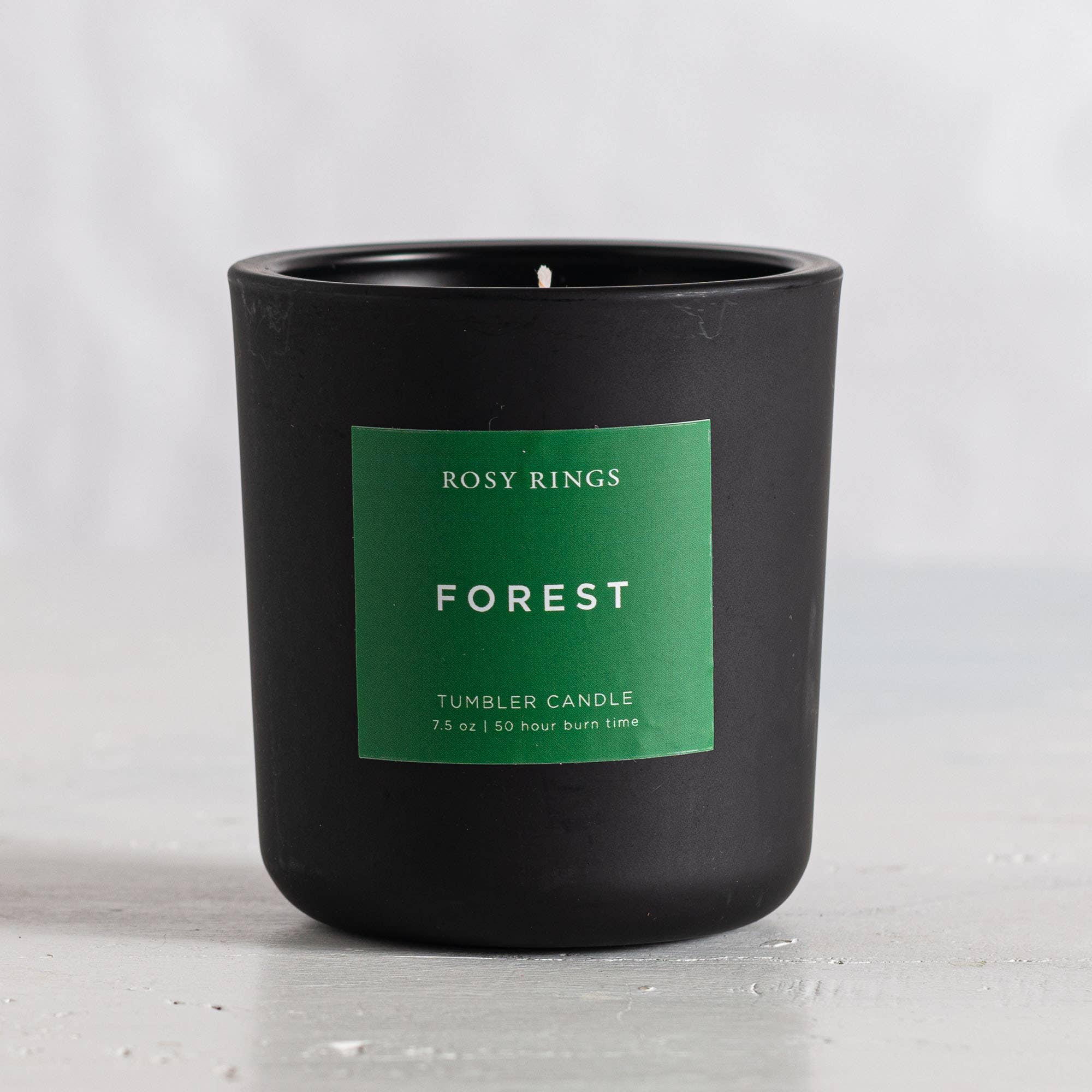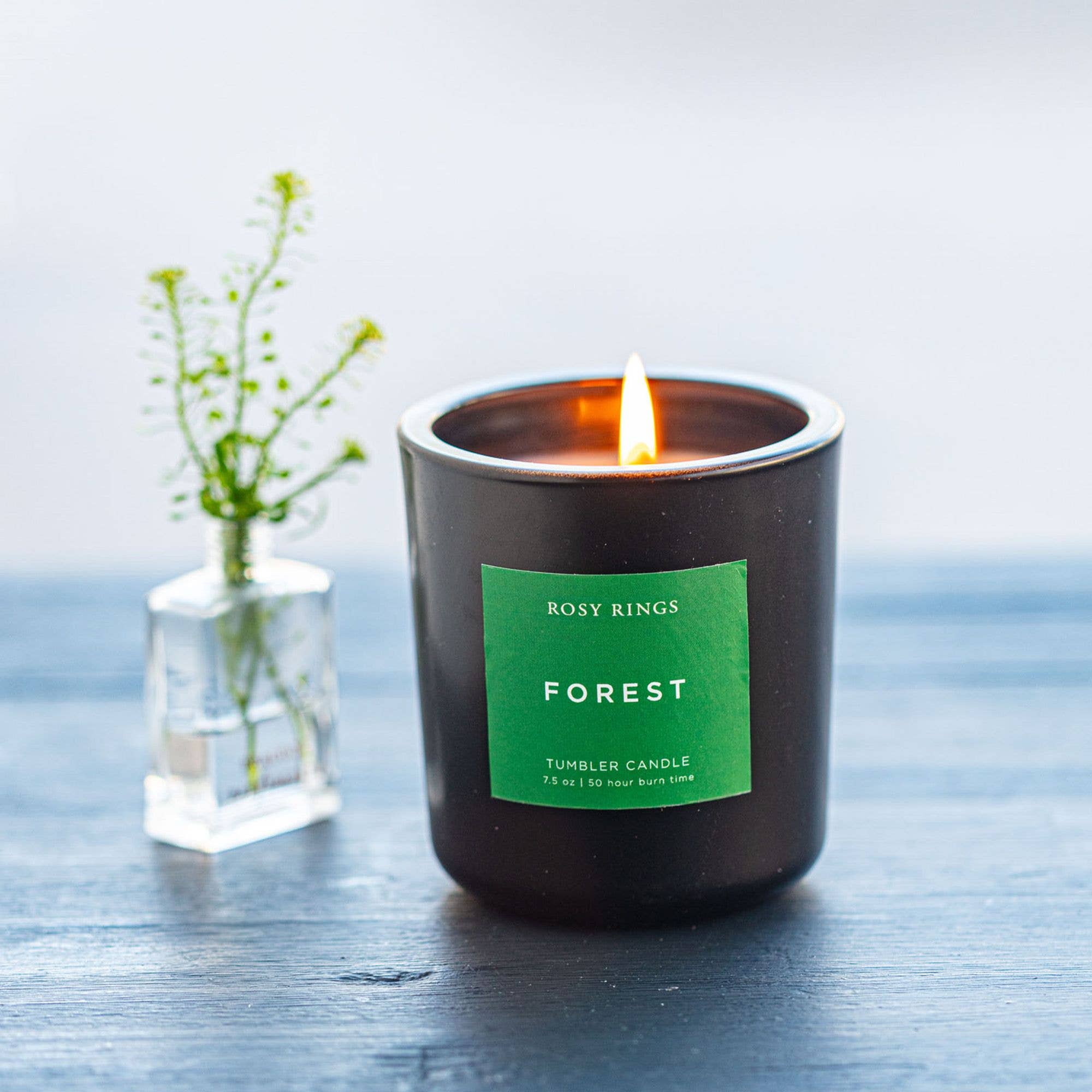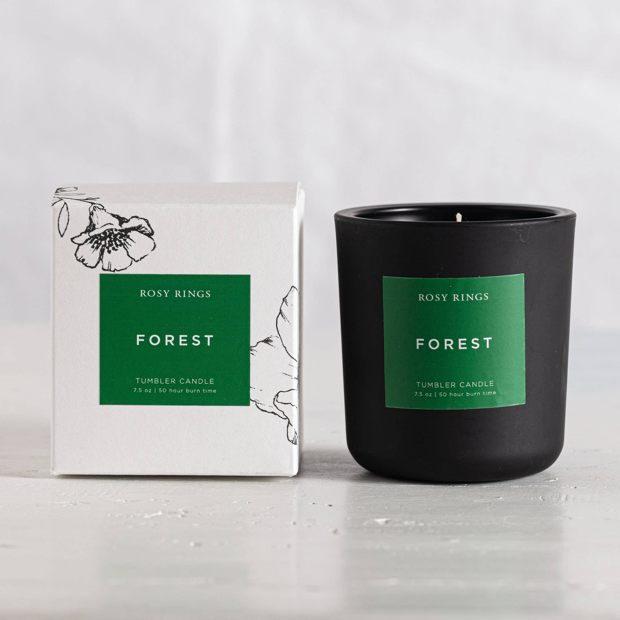 The Forest Signature Boxed Tumbler boasts a 50-hour burn time with 1 ounce of wicks and 7.5 ounces of fragrance. Enjoy the transformative scents of clary sage, falling leaves, scotch pine, creamy santal, red cedar, and white musk. Candle dimensions are 3.7"H by 3.25" in diameter.