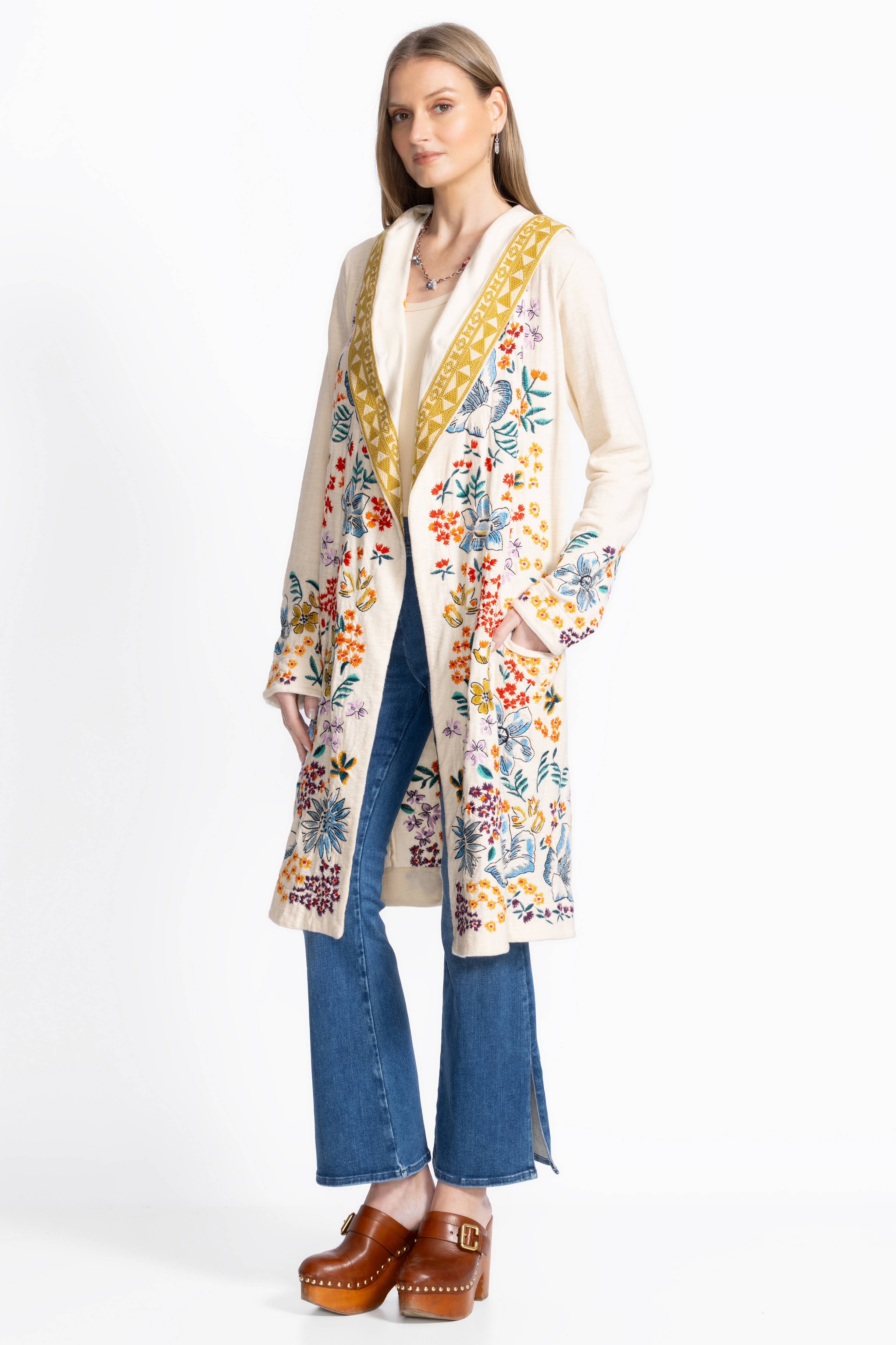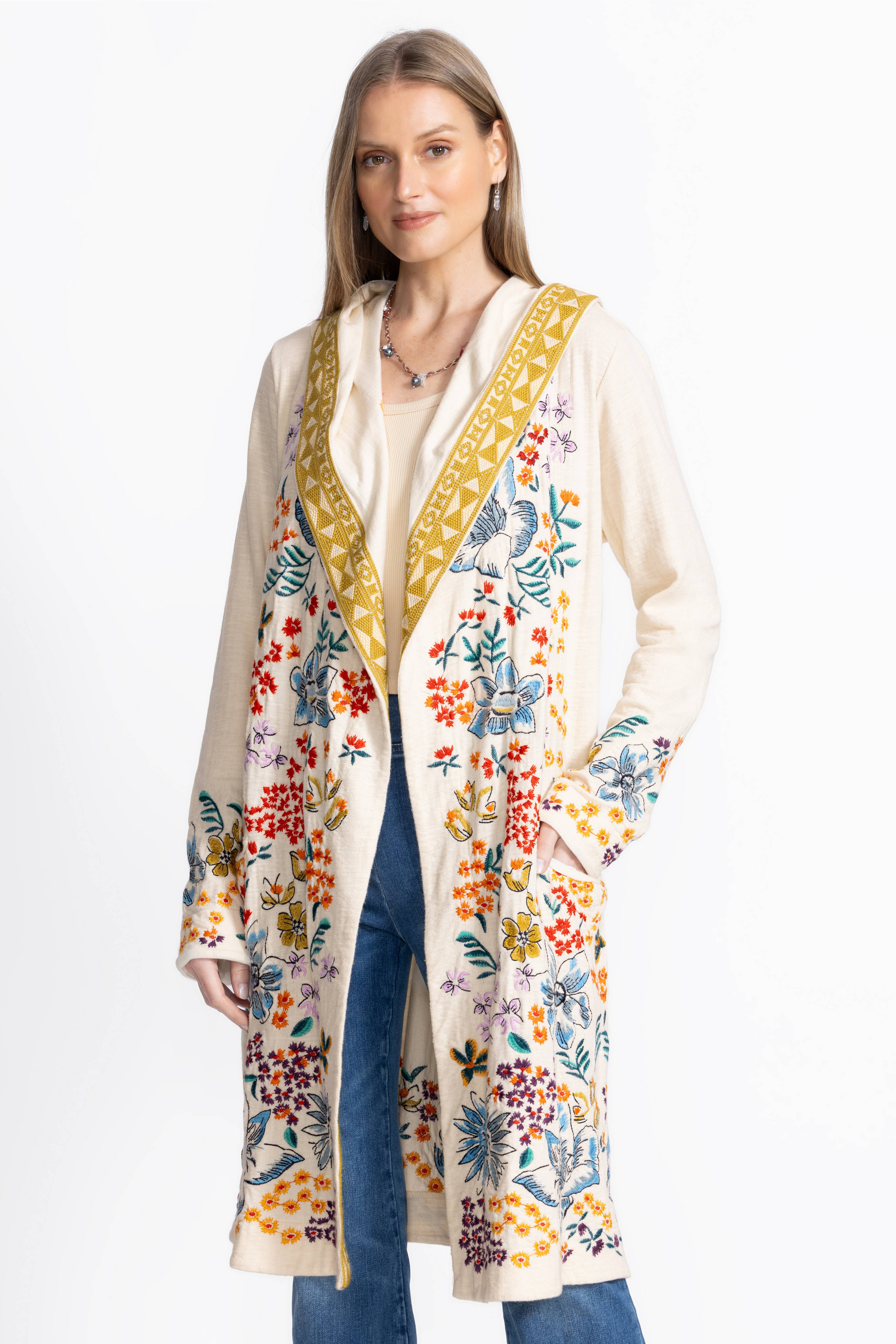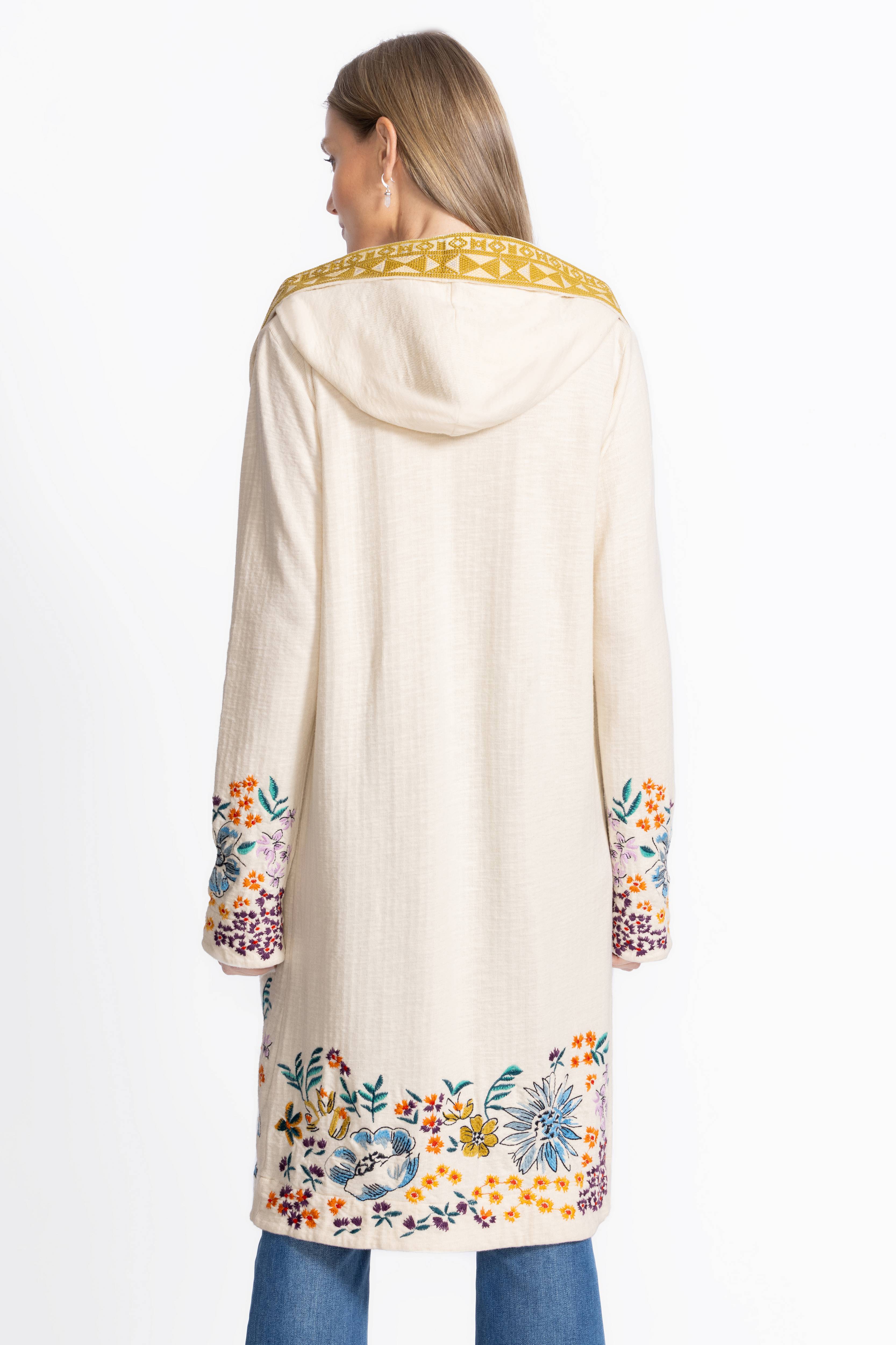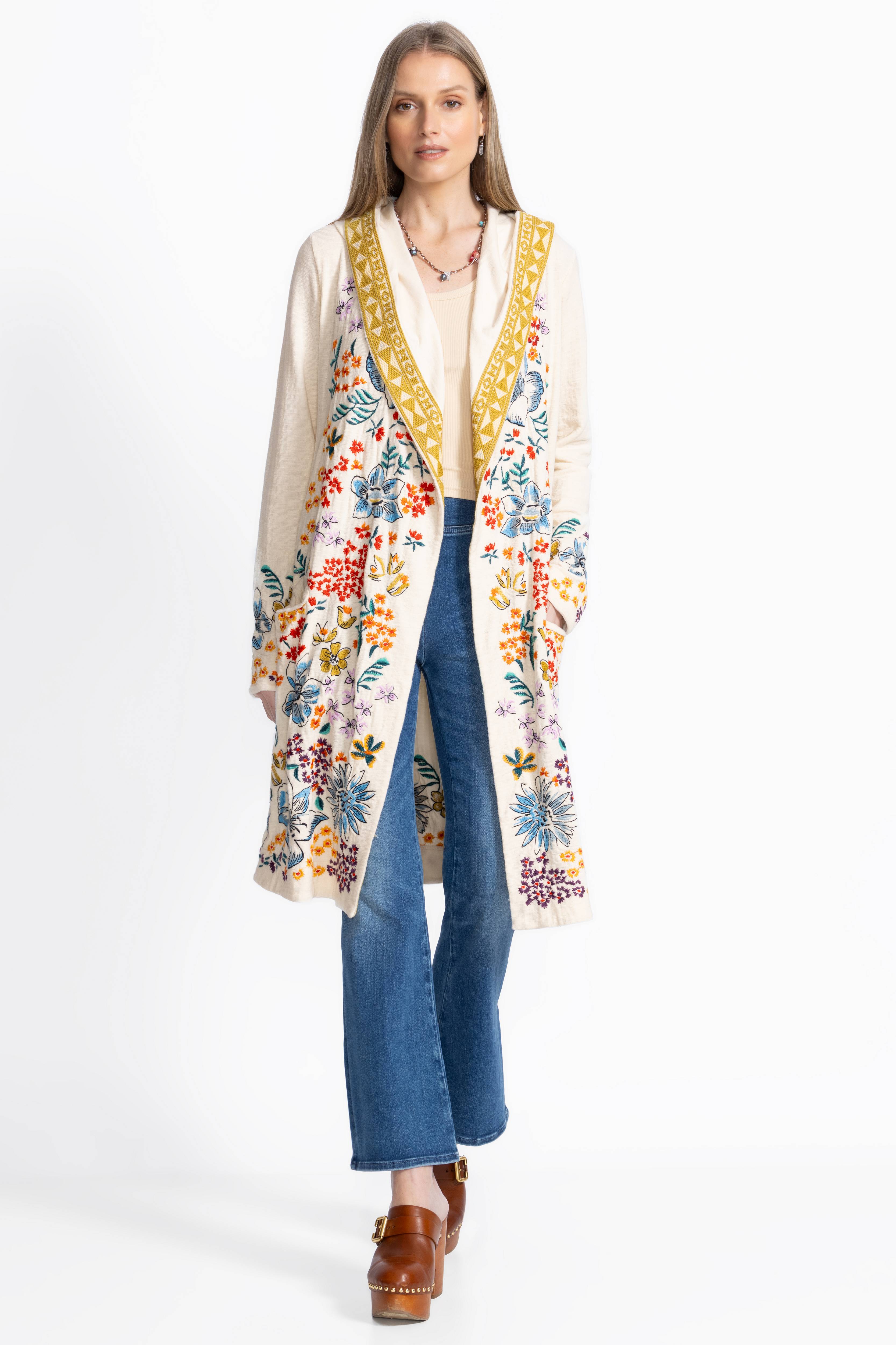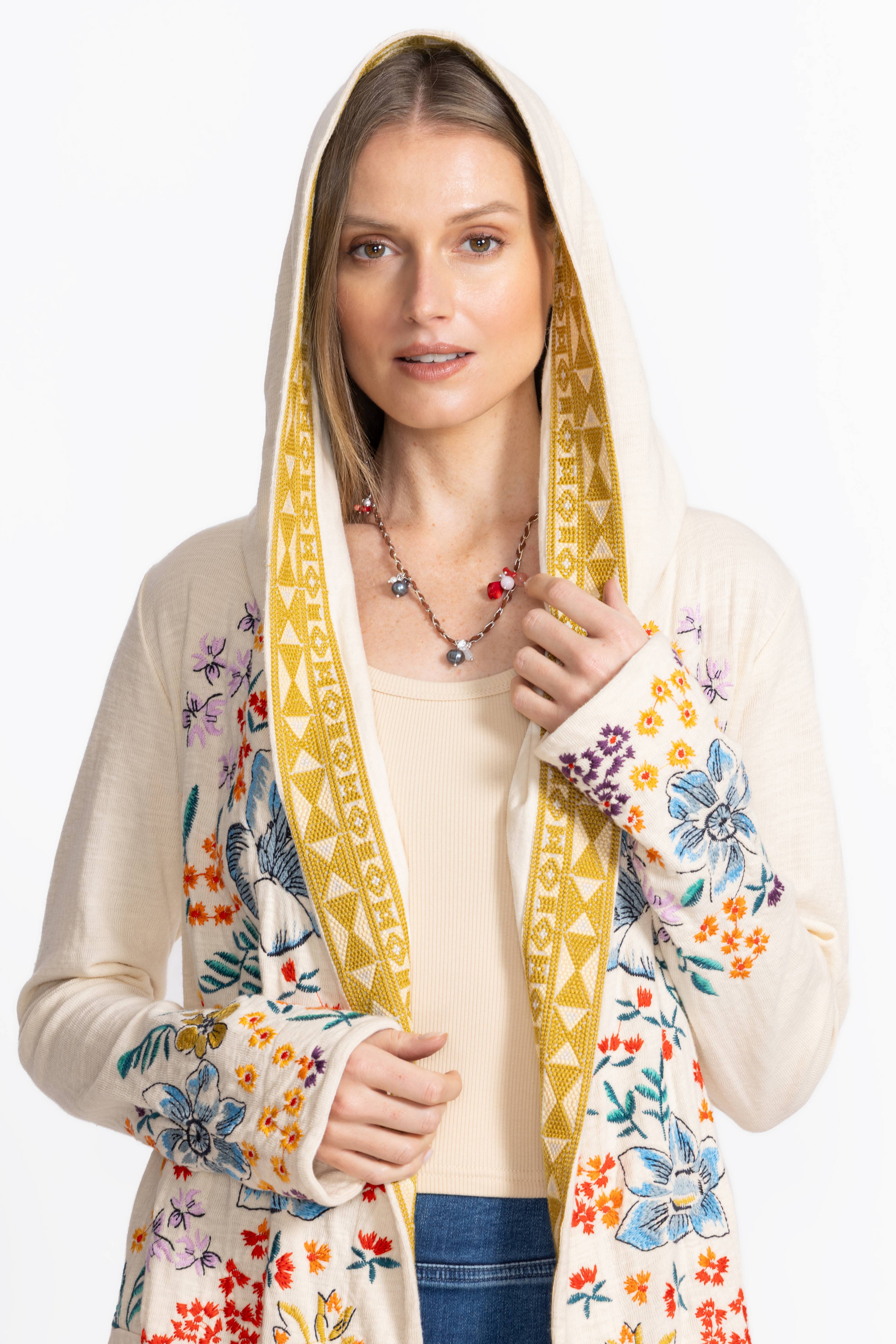 Light and lovely, the Biya Duster-Cameron brings charm to any outfit with its intricate floral embroidery and eye-catching trim. Made from 100% breathable cotton, it feels as cozy as it looks, complete with a snug hood and handy slip pockets. Perfect for layering over your favorite tee and denim, this duster adds a fun, effortless flair to everyday wear.