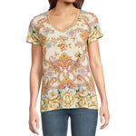 Elevate your everyday look with the Janie S/S V-Neck Tee-Scroll. This feminine twist on the classic t-shirt features a hint of stretch for ultimate comfort and versatility. Perfect for layering, this elegant tee is a must-have in your wardrobe. Pair with white linen pants and a denim jacket for a chic and effortless style.