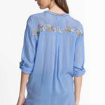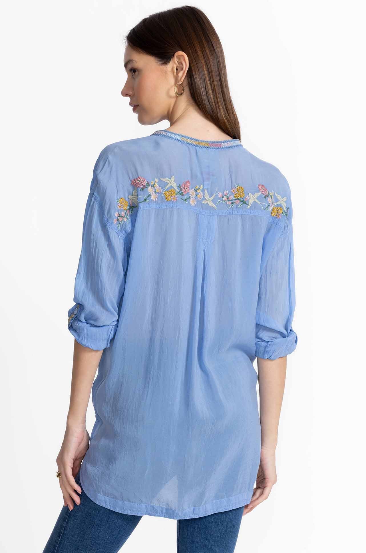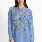 Introducing the Zinnia Tunic-Zitka, crafted from 100% cupra rayon for a luxurious feel. Adorned with stunning bird and bird cage embroidery, in a soft periwinkle blue hue. Enjoy the perfect blend of elegance and comfort in this exclusive piece.