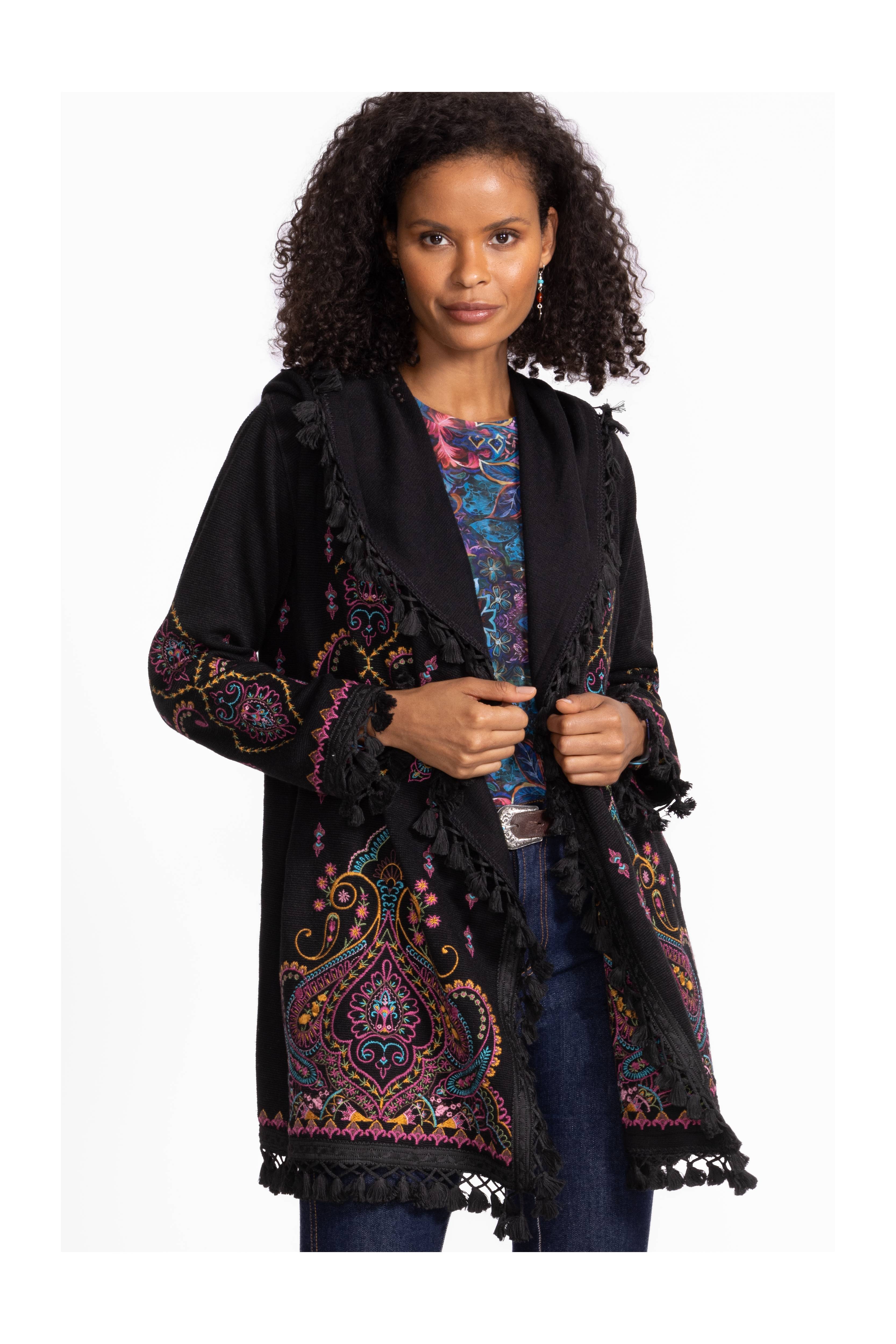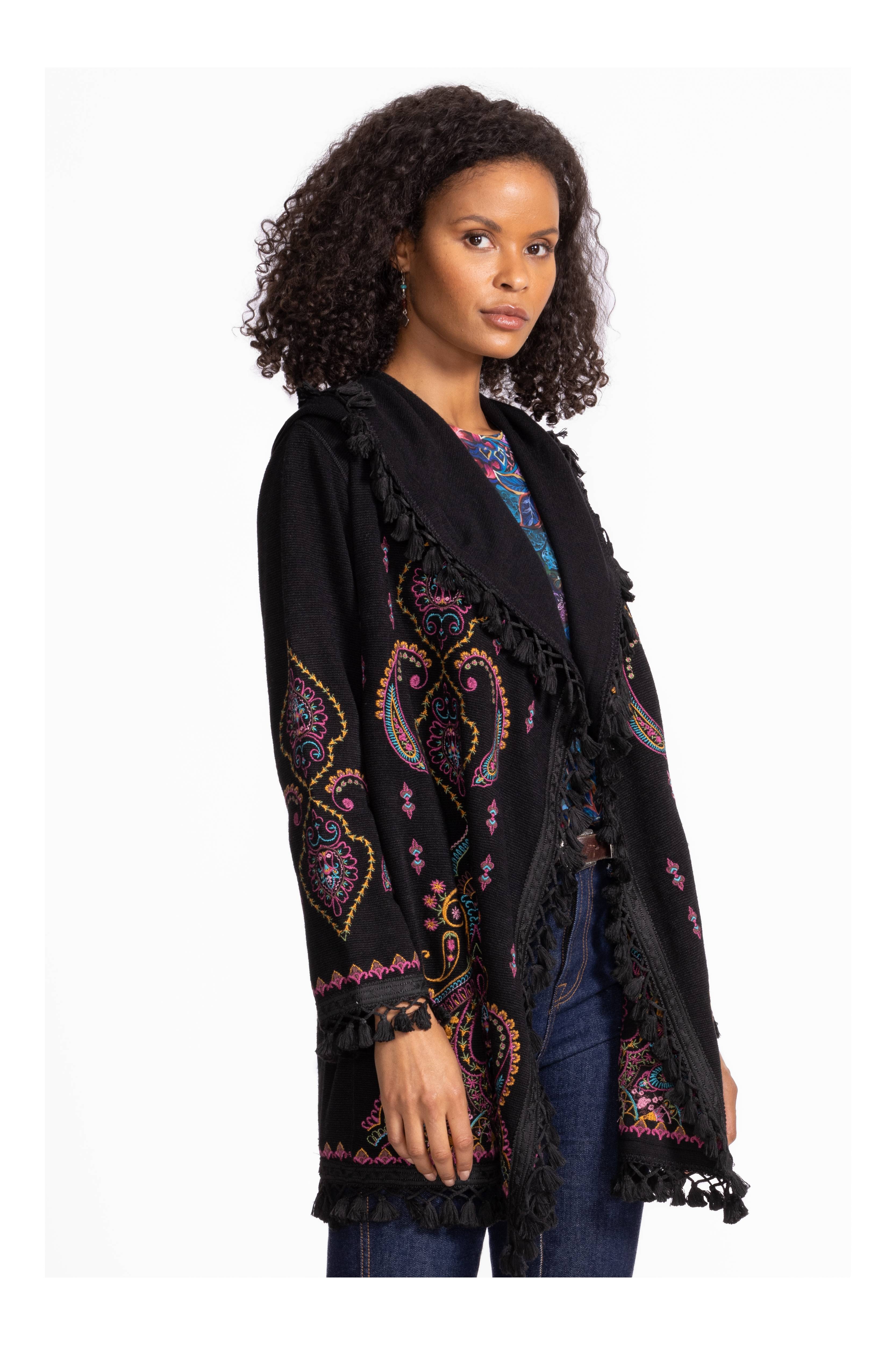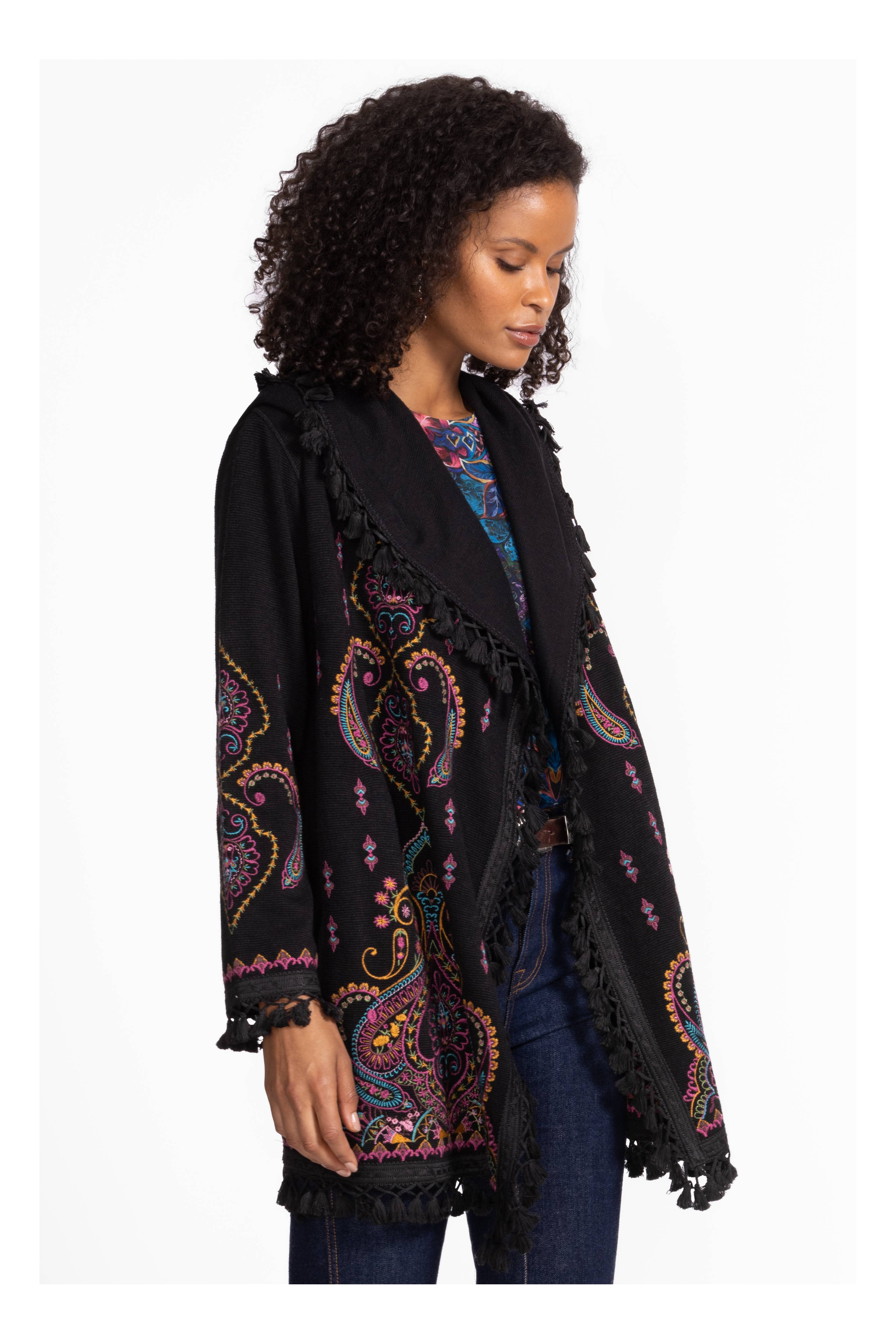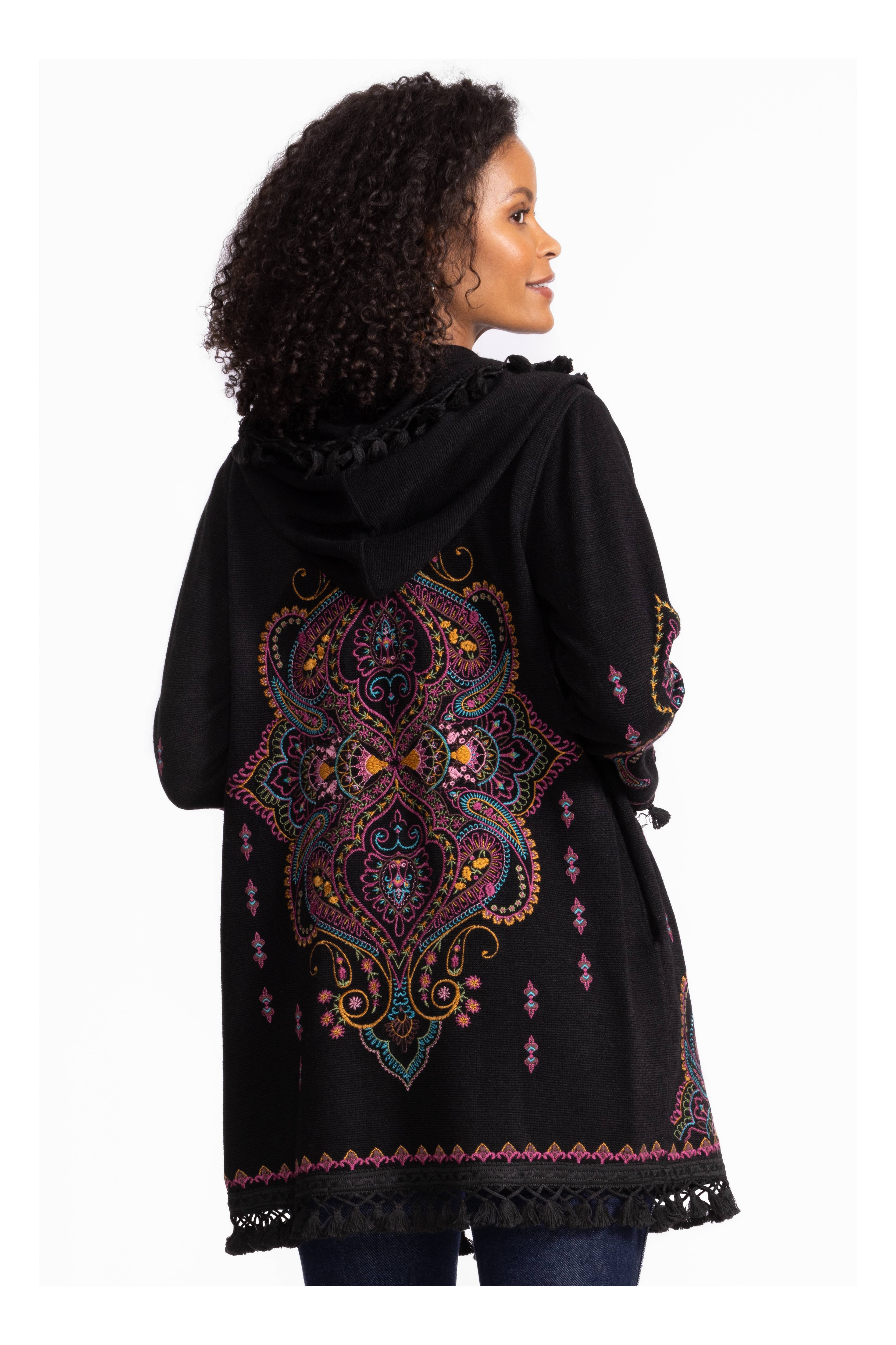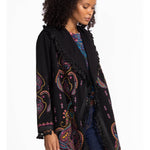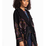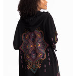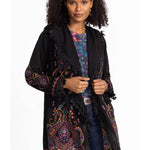The Biya Midi Hoodie-Angela brings a fun twist to cozy style with its vibrant pattern and detailed embroidery. Designed with an open front and hood, it’s perfect for layering over your favorite tank and leggings. Pockets add practicality, while fringe at the hem and sleeves gives a playful, boho vibe that turns everyday casual into something special.