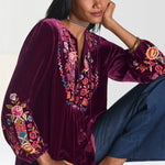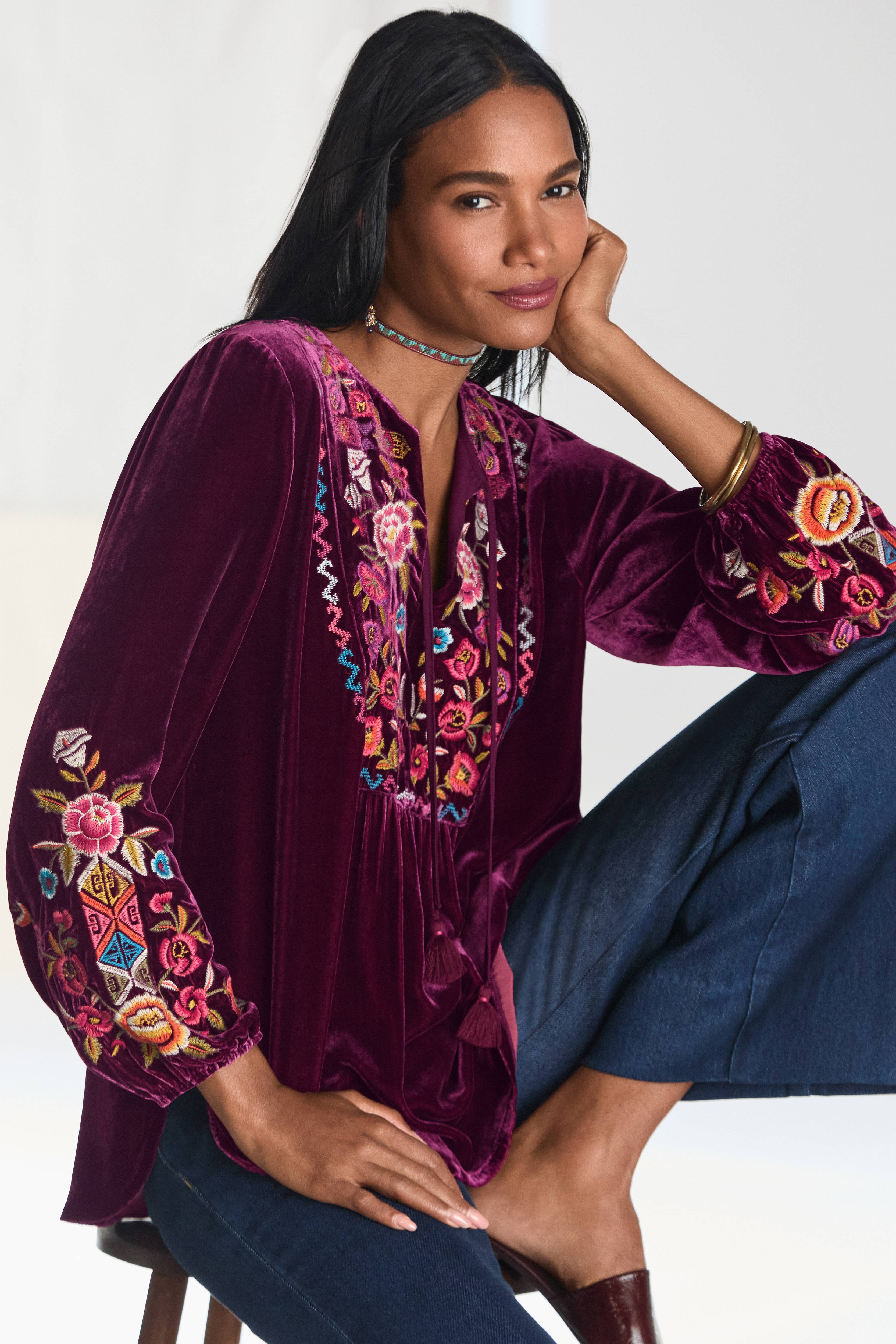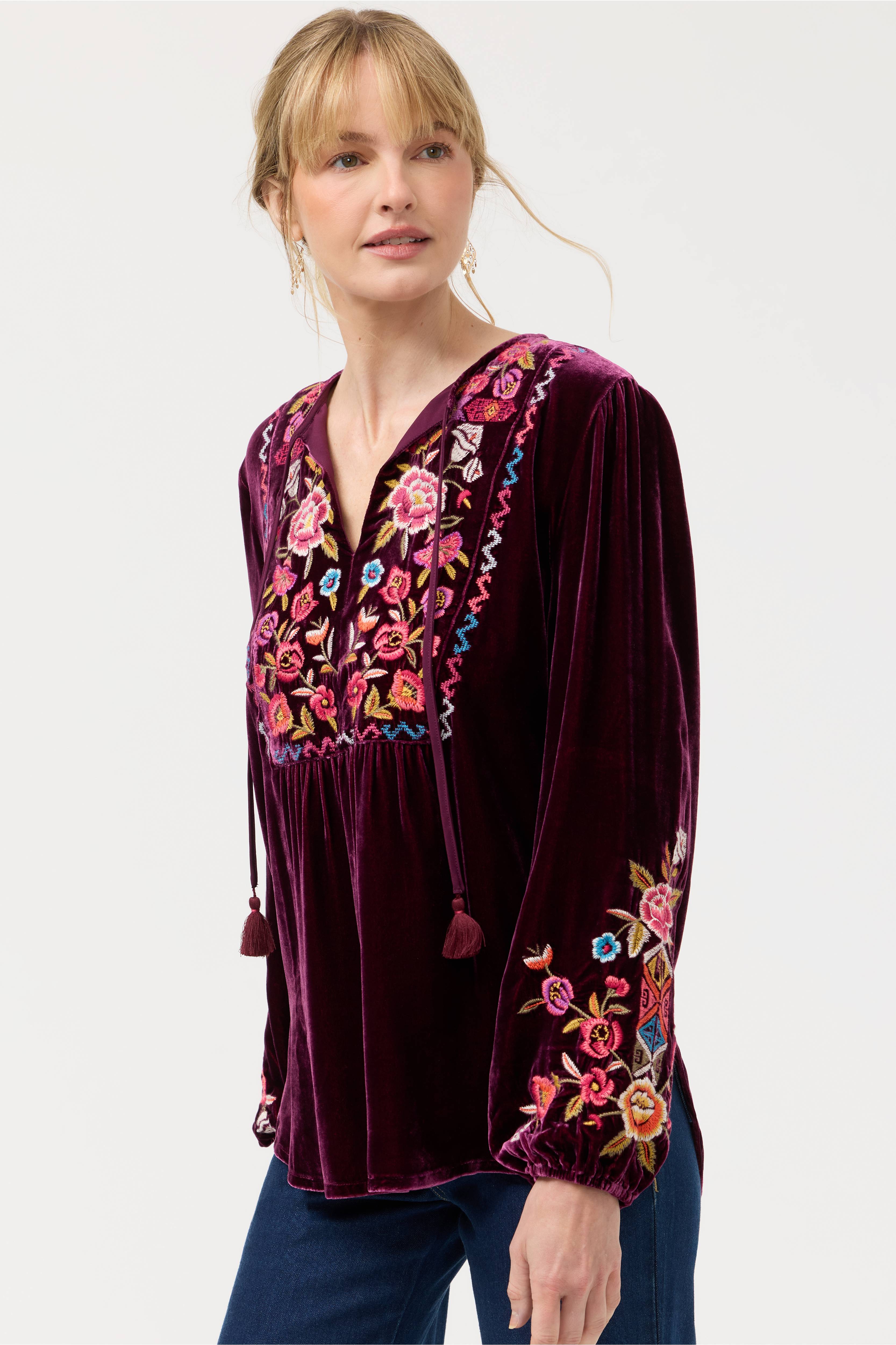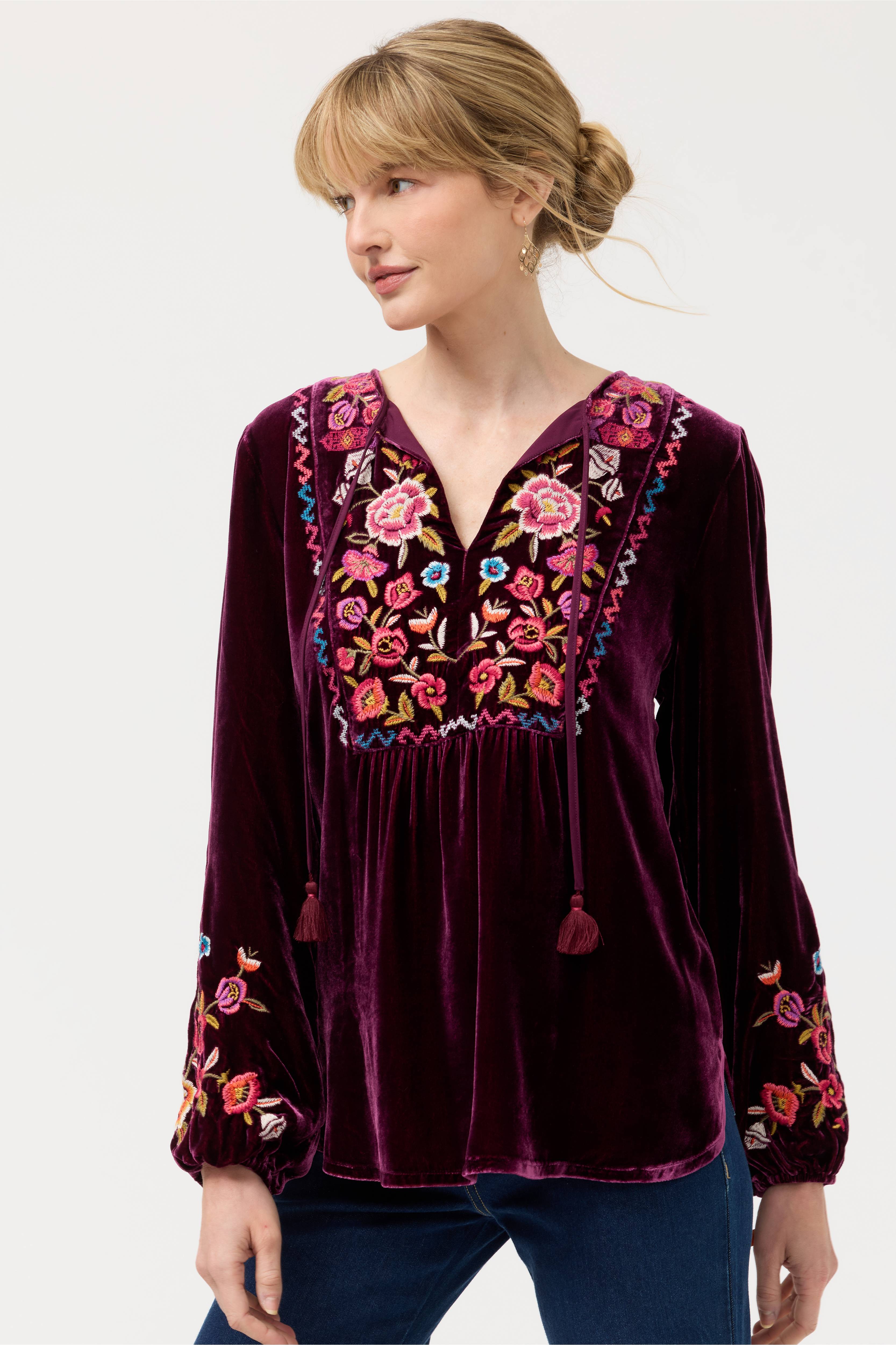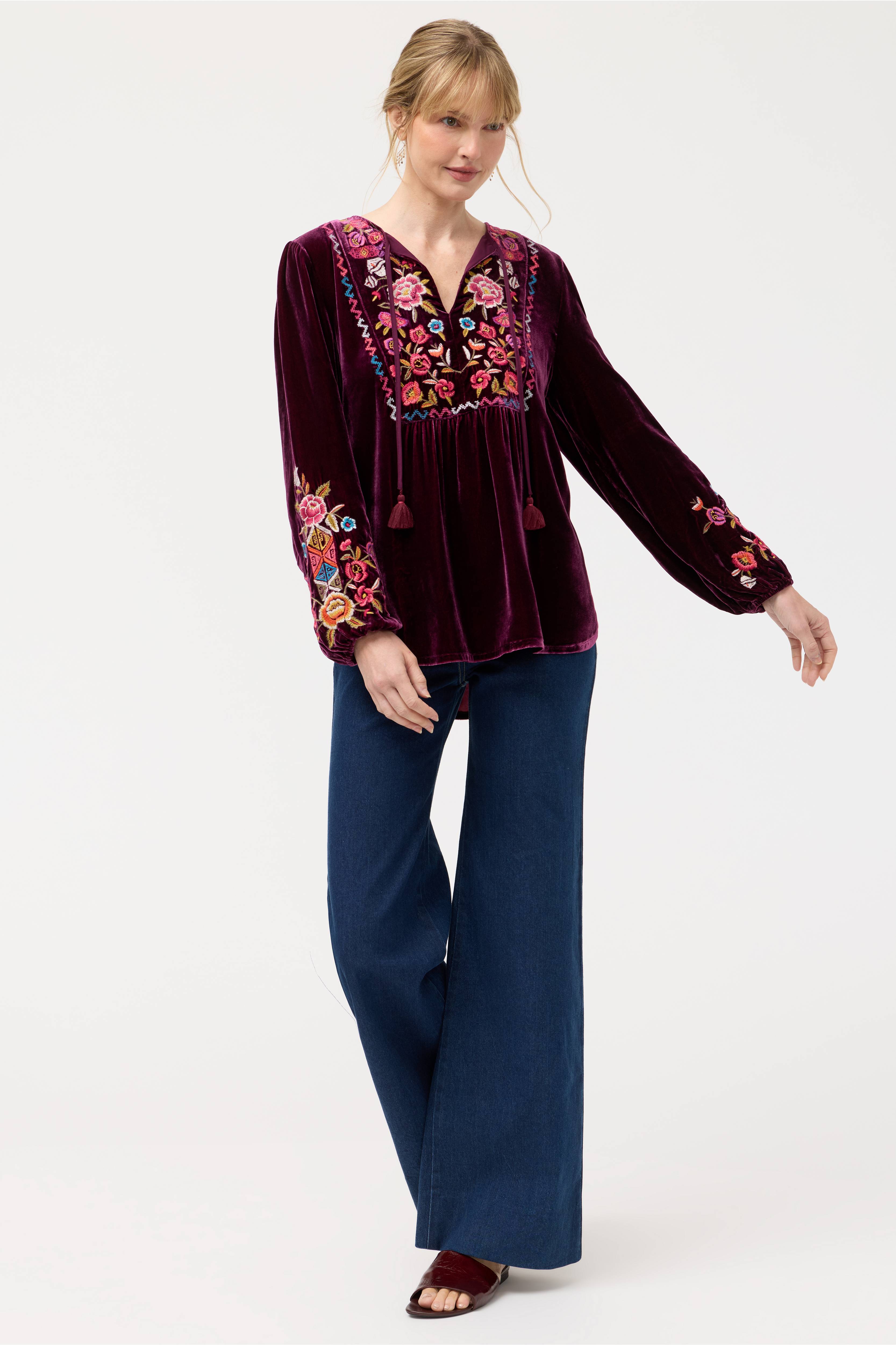 Elevate your everyday style with the Anaya Curved Hem Prairie Blouse—a showstopper crafted from luxurious silk blend fabric. Intricate embroidered florals dance across the vibrant yoke, while a split V-neckline adorned with playful tassels adds just the right amount of flair. Billowing Bishop sleeves and gathered edges create effortless movement and charm. Whether you're heading out for a casual night with friends or looking to add personality to your wardrobe, this blouse pairs beautifully with denim and wedges for an instantly chic look.