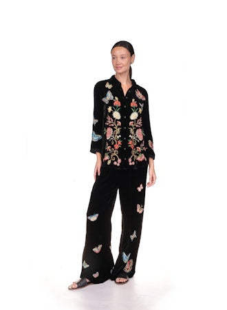 Transform your outfit into a whimsical masterpiece with the Luciana Velvet Kimono Shirt. Made from 82% rayon and 18% silk, this kimono-sleeved blouse features stunning butterfly embroidery for an elegant touch. Perfect for adding a touch of playfulness to any look.