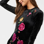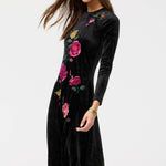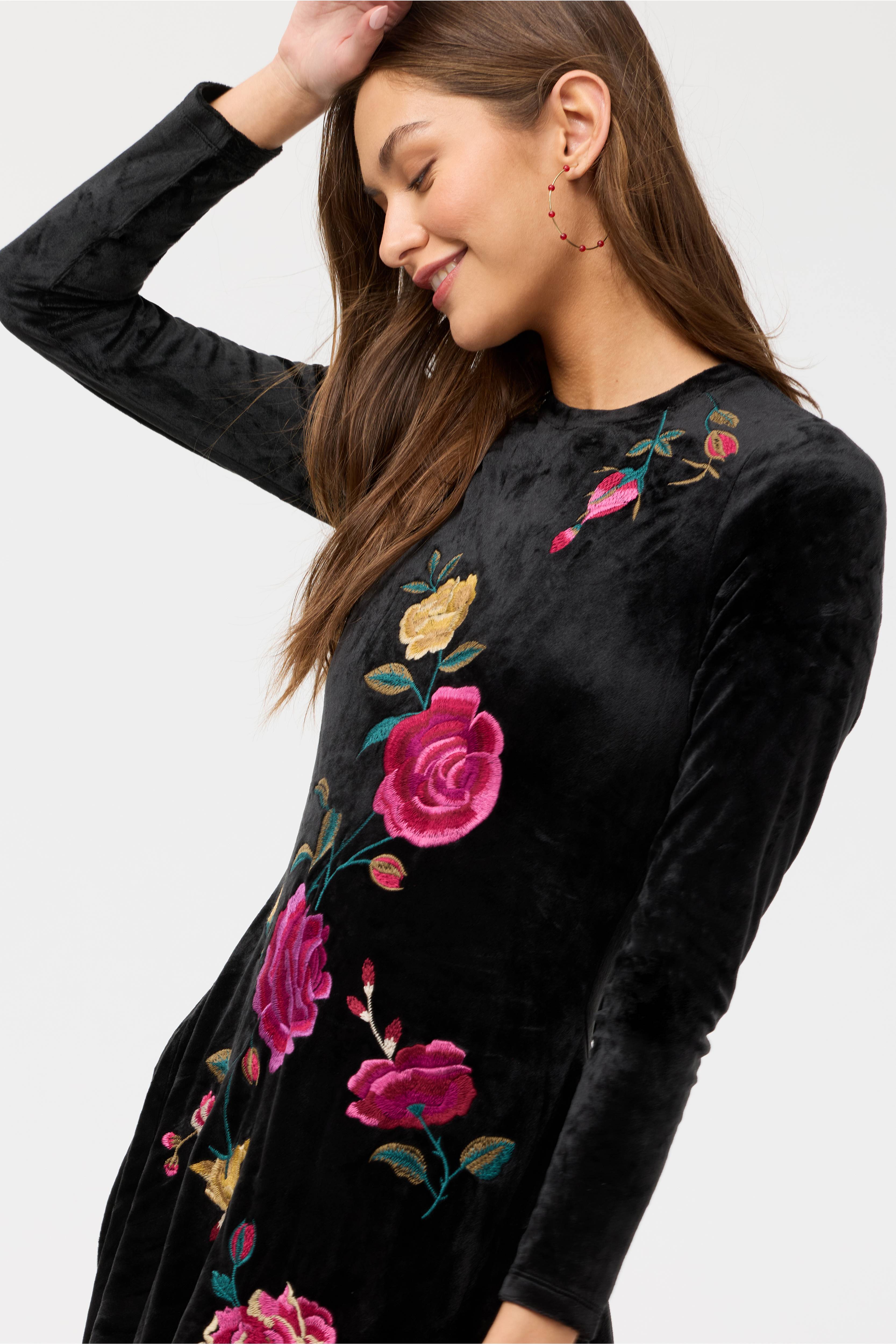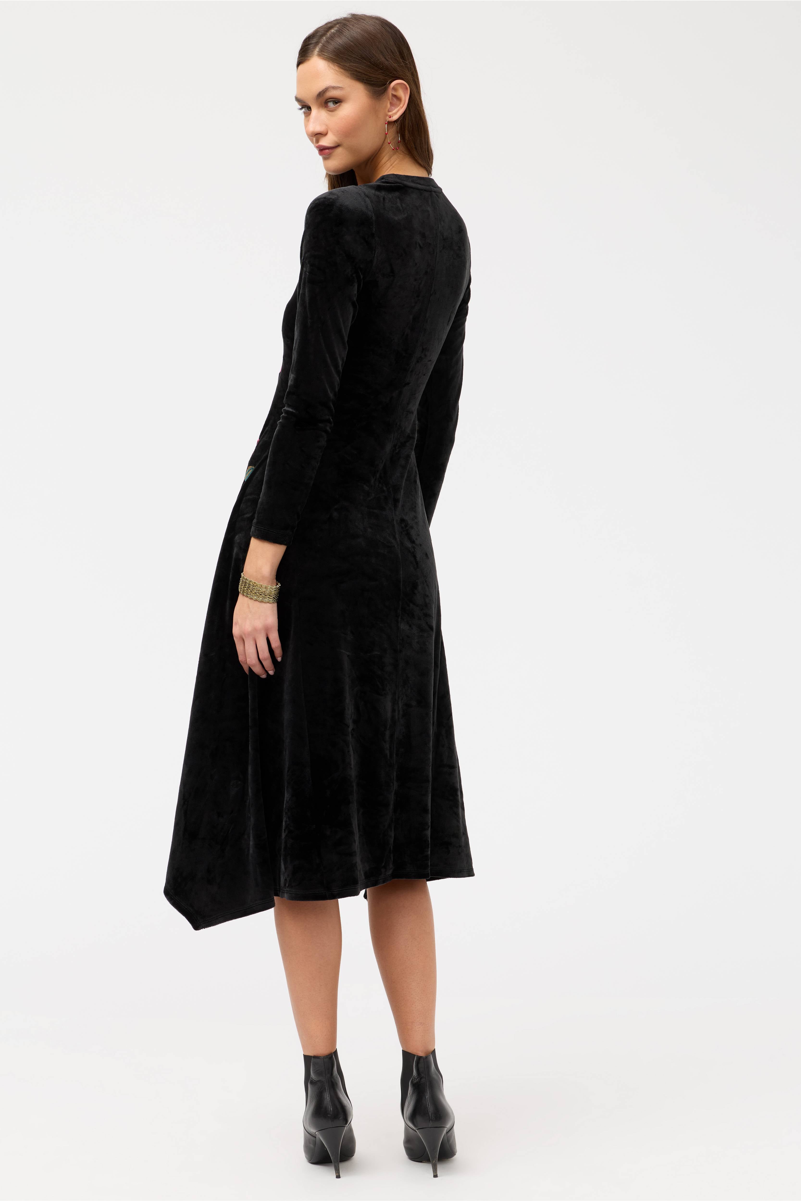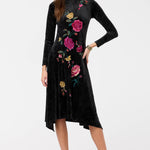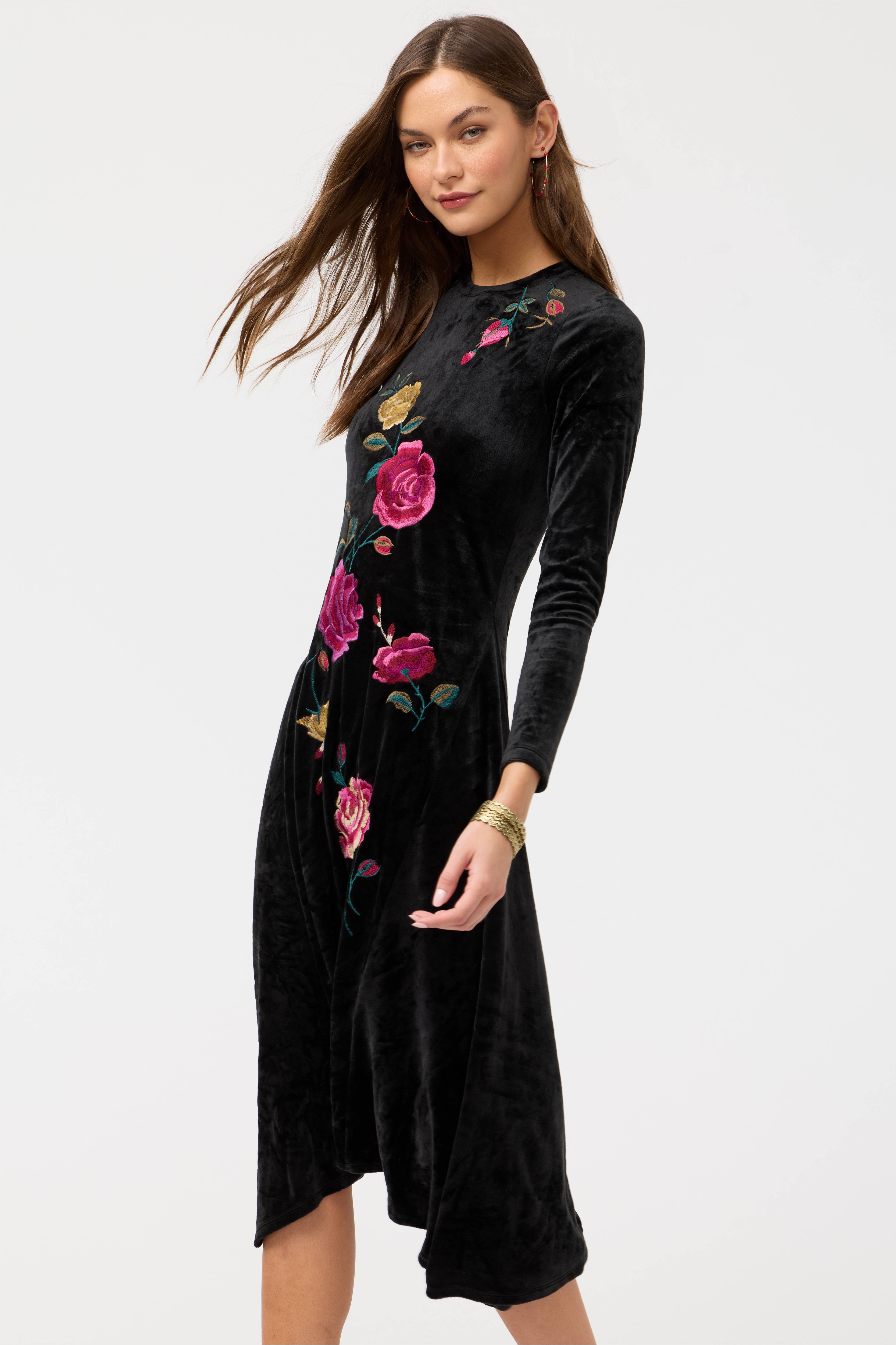 Step into elegance with the Rosalia Handkerchief Hem Velour Dress—a showstopper that turns heads with its vibrant florals and eye-catching embroidered details. The soft velour fabric drapes beautifully, while the crew neckline and long sleeves offer timeless sophistication. That flowy handkerchief hemline? Pure magic for twirling into your next adventure. Style it with black riding boots and a colorful shawl for an effortlessly chic evening look that says you know how to have fun in fashion.