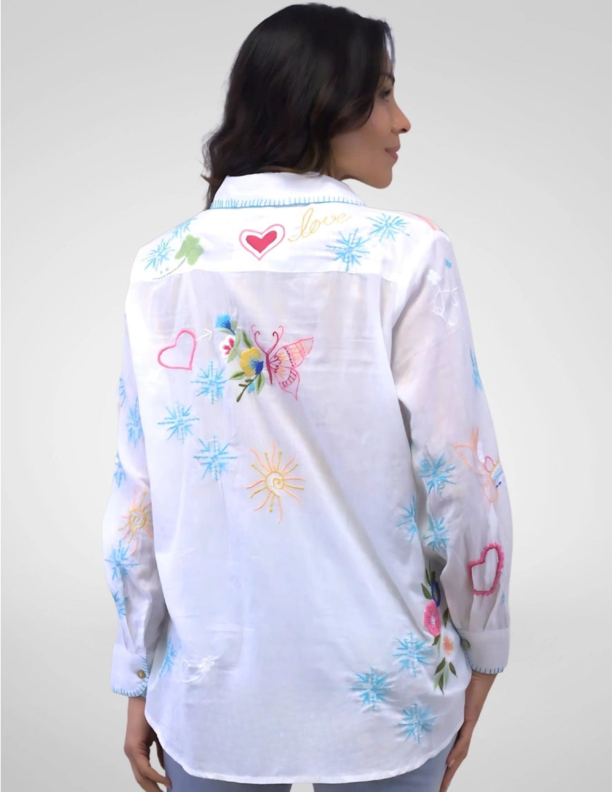 Features charming whimsical embroidery that adds a playful, artistic touch to the classic tissue cotton weave.Shipping & Returns