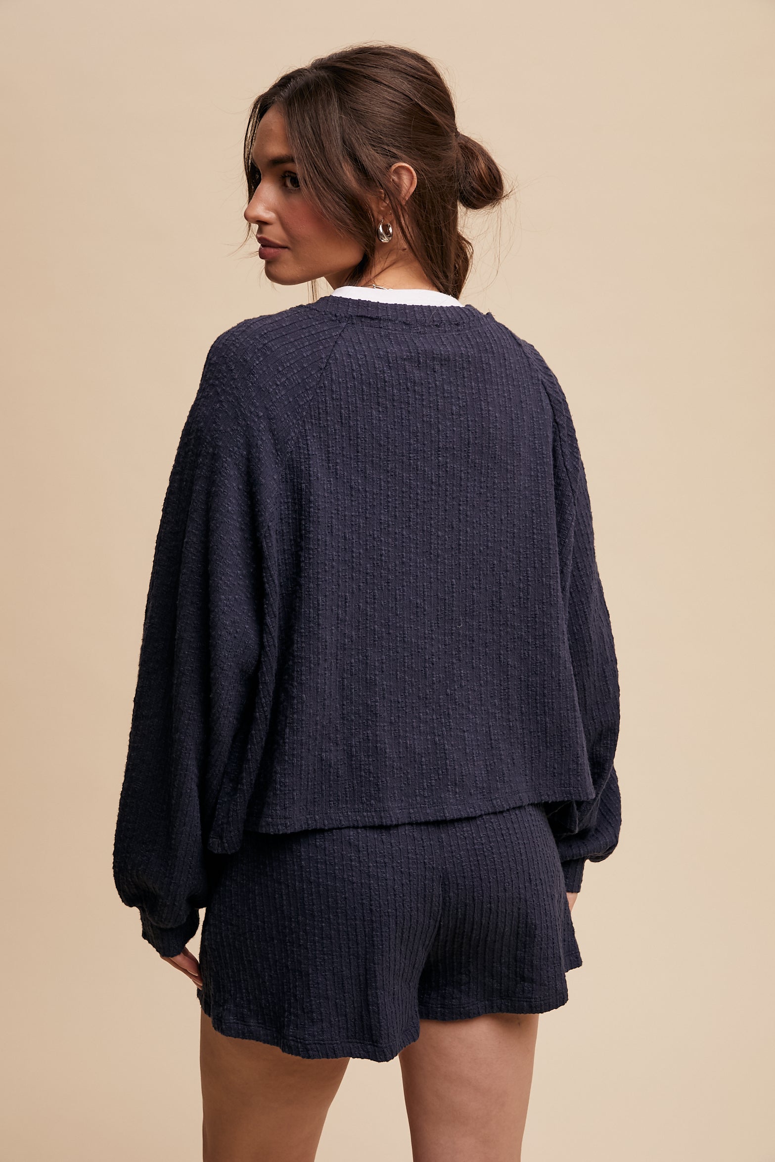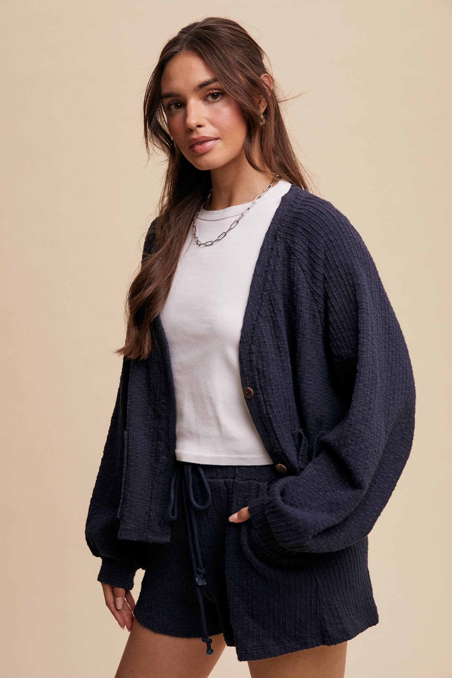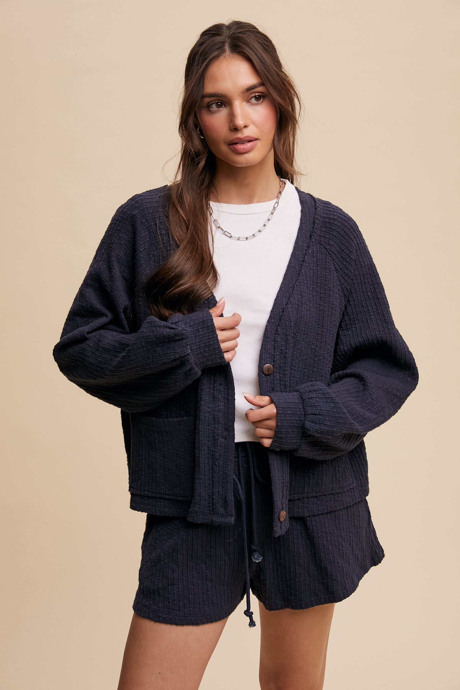 Effortlessly chic and cozy, our Cardi + Shorts Ribbed Knit Set is perfect for lounging or running errands. The button-down cardi features long sleeves and patch pockets, while the shorts have a drawstring waist and pockets for functionality. Finished with a clean hem, this set is a must-have. (And did we mention pockets?)
