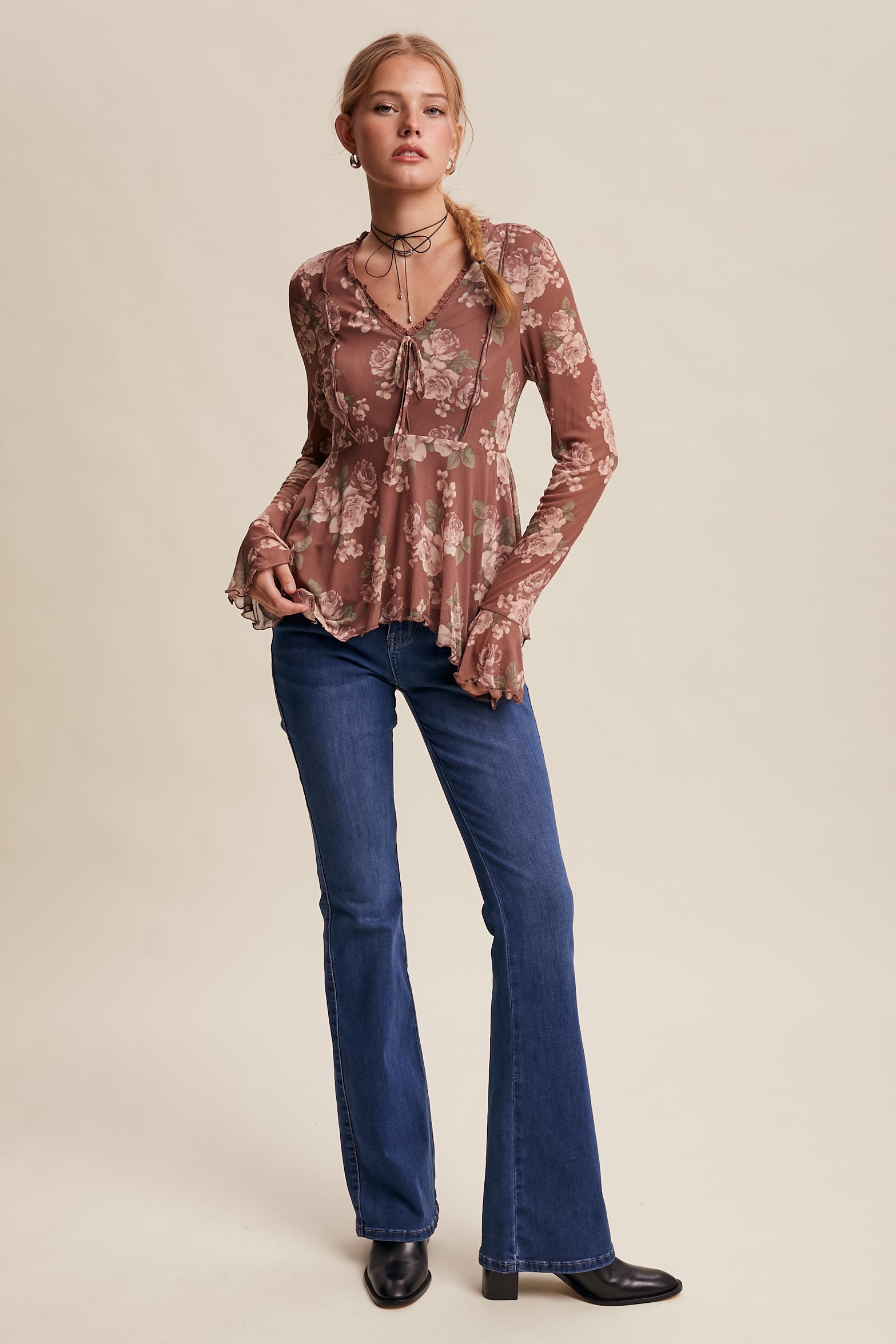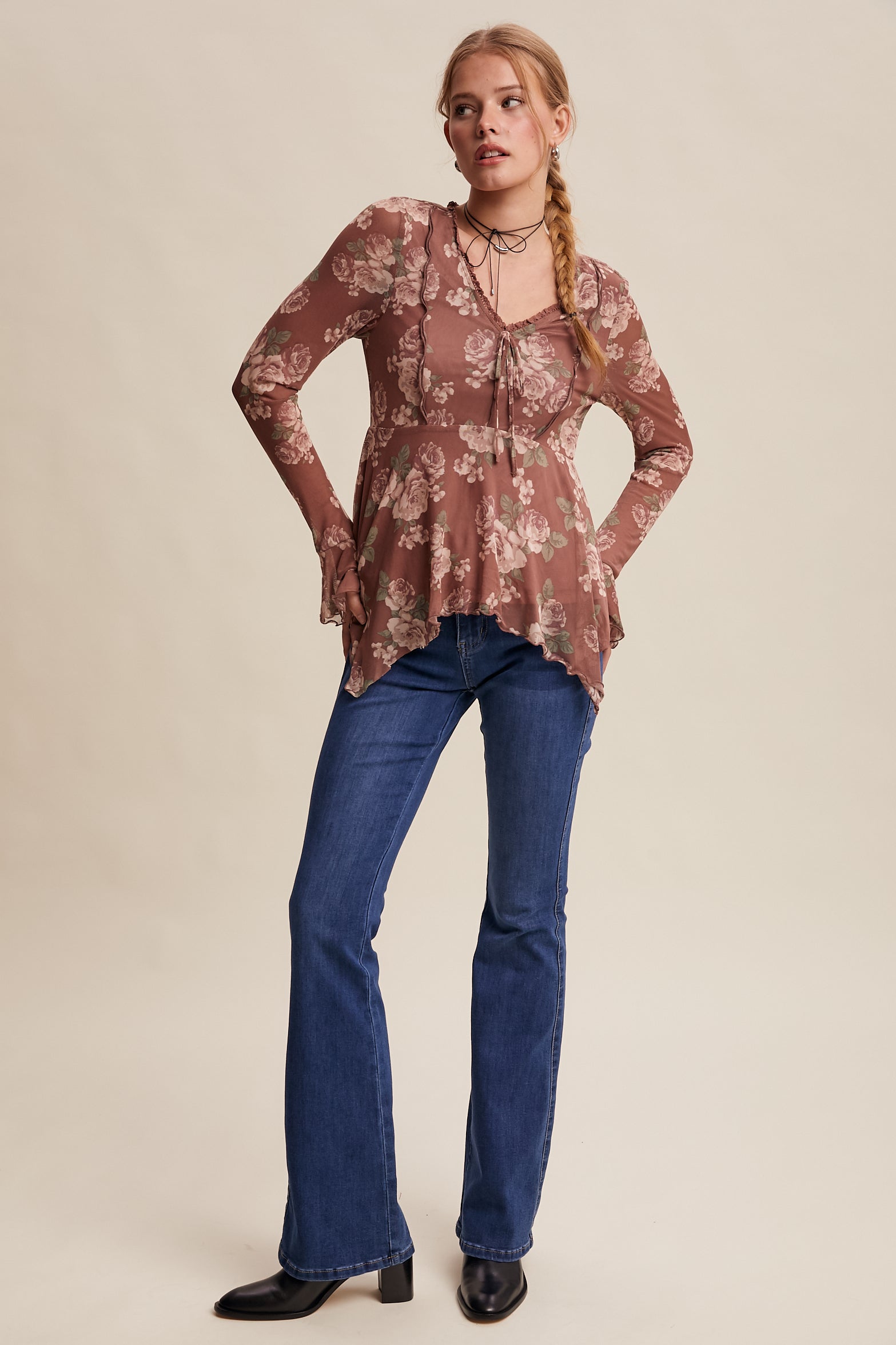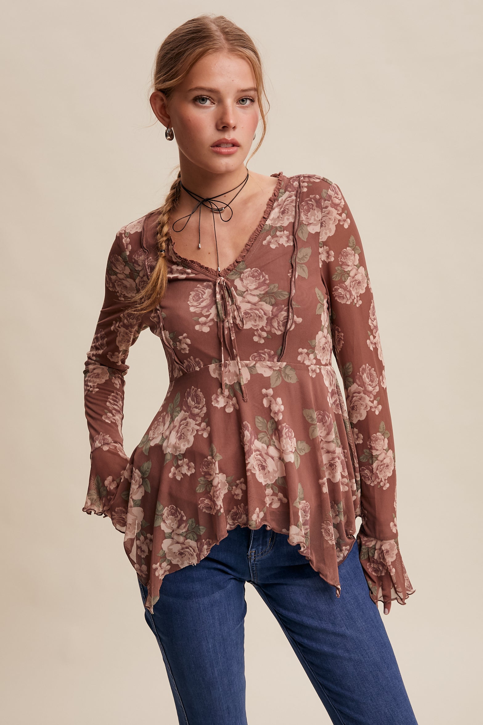 Bring a touch of romance and whimsy to your look with this Floral Mesh Handkerchief Blouse. Its lightweight, stretchy mesh feels soft and airy, while the vintage rose print pops against sleek black. Playful details like the tie-front neckline, lettuce-edge trim, and flounce sleeves create a flirty, flowy vibe. The handkerchief hem adds graceful movement, and the fully lined bodice keeps you comfortable and confident all day long.