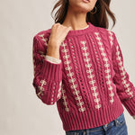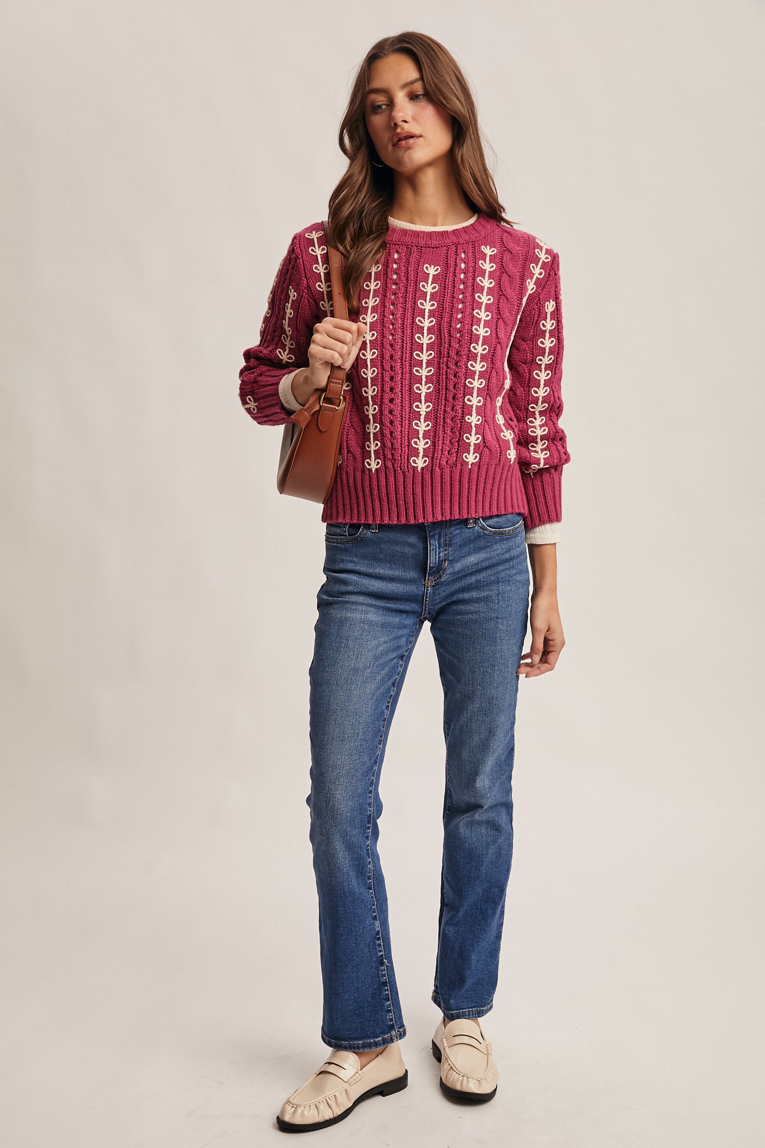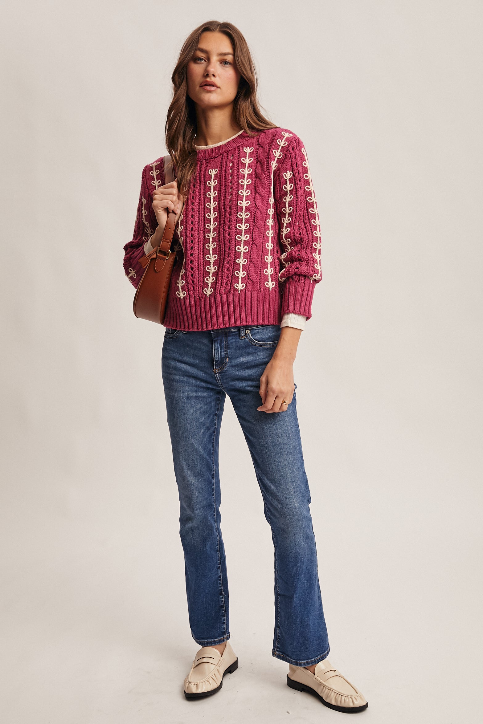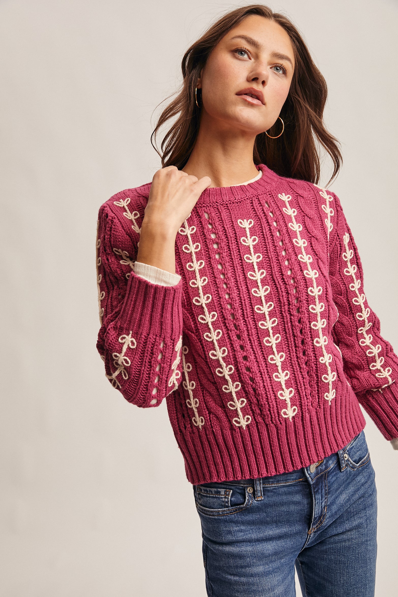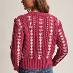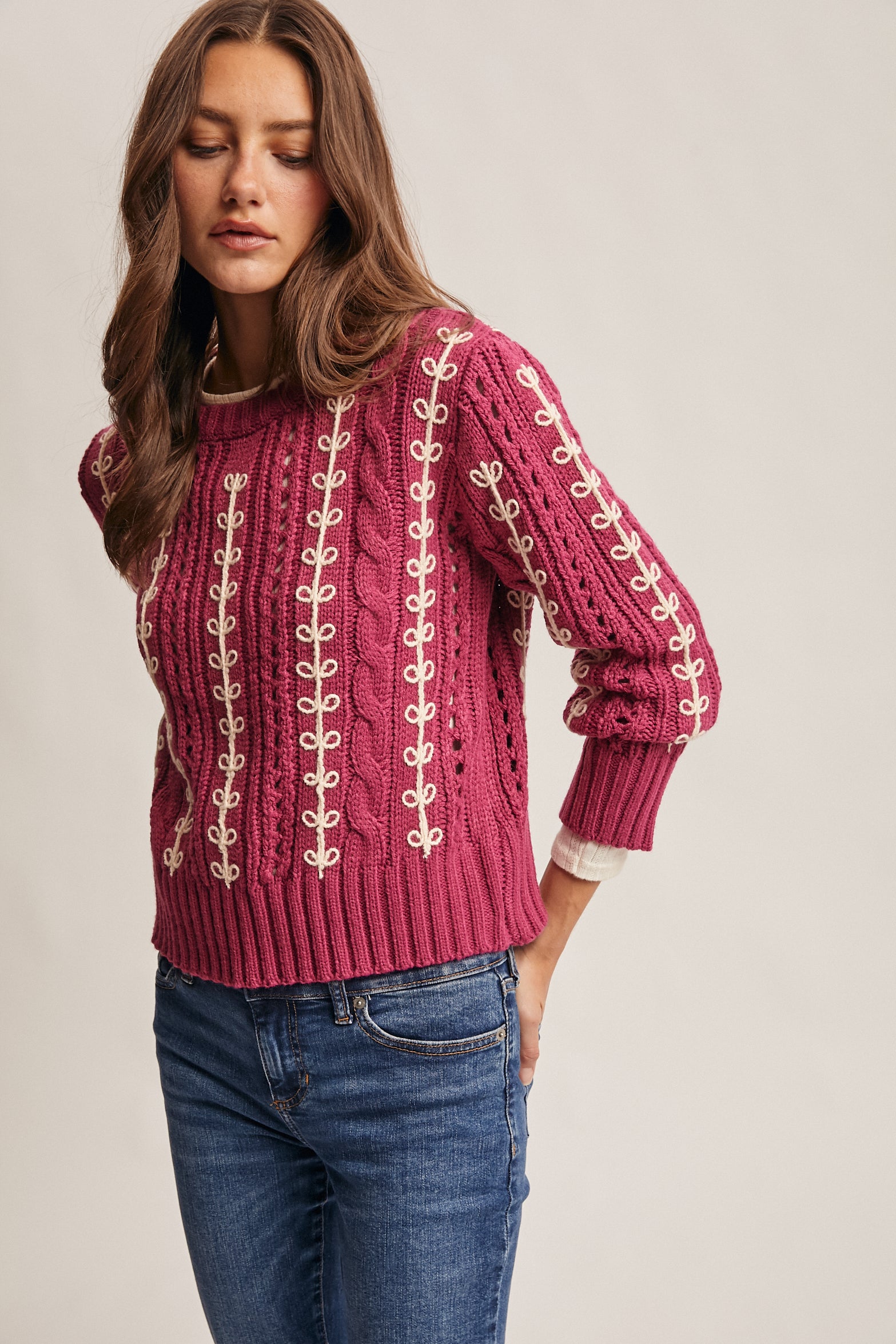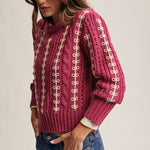 Wrap yourself in cozy charm with this chunky cable knit sweater featuring creamy loop embroidery that dances across the fabric. The relaxed, slightly cropped silhouette pairs perfectly with full-length sleeves and ribbed trims at the neckline, cuffs, and hem for a secure fit. Medium-weight and wonderfully textured, it's your new go-to for effortless style—throw it on with jeans and let your personality shine through.
