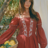 This embroidered maxi dress features a lightweight woven cotton blend with a soft, airy drape and a fully lined interior for comfort. Its flattering square neckline is enhanced by vintage-inspired embroidery, while puff sleeves with smocked upper arms and elastic cuffs create a romantic silhouette. The fitted bodice with smocked sides offers stretch and shape, complemented by a lace-up back for an adjustable, corset-style fit. The flowing A-line skirt with gentle gathers ensures graceful movement, making this dress an elegant choice for any occasion.