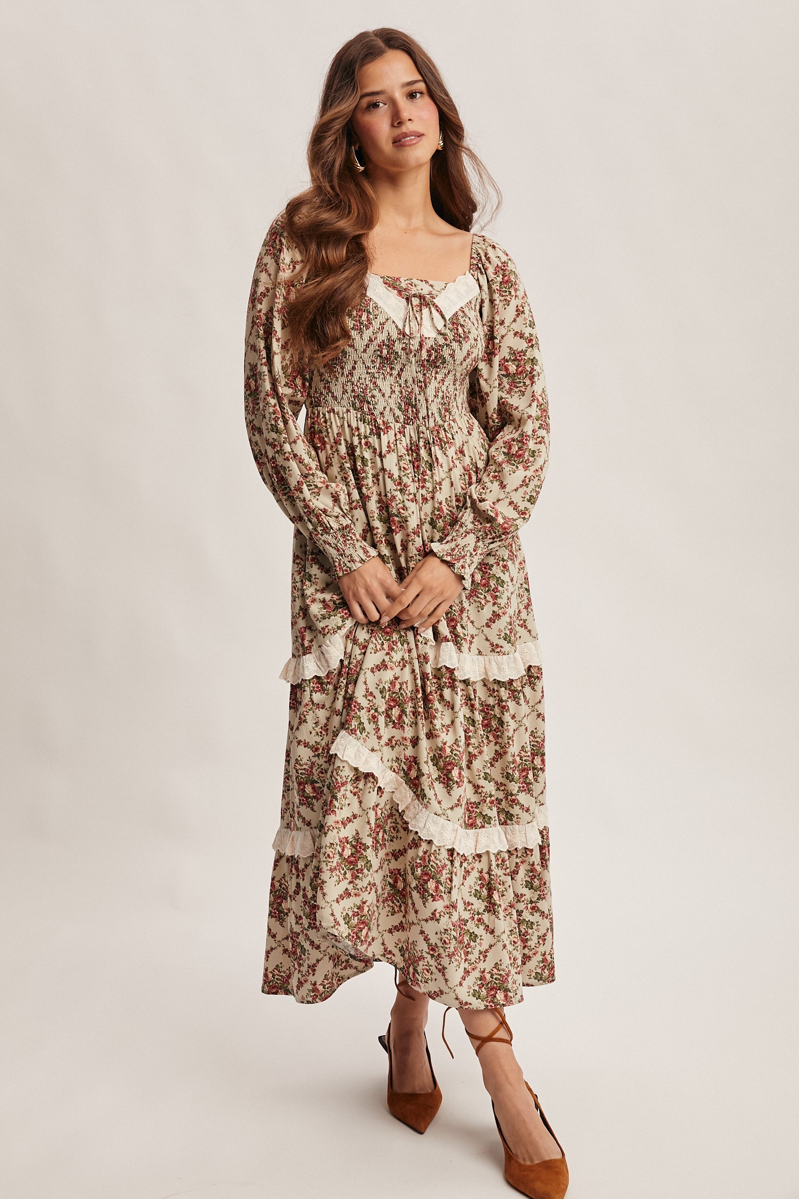 Embrace carefree charm with the Smocked Bodice Floral Maxi Dress. Crafted from lightweight woven fabric and fully lined, it feels soft and comfortable all day. The stretchy smocked bodice shapes your figure while delicate eyelet lace trims add a sweet, romantic touch. Long puff sleeves and a tiered maxi skirt flow gracefully with every step. Plus, hidden side pockets keep essentials close. Perfect for weekend adventures or layering with your favorite cardigan, this dress brings easy boho vibes with a playful twist.