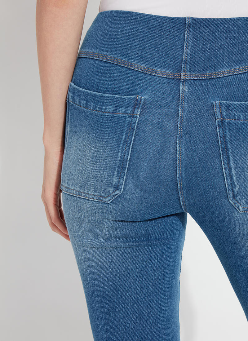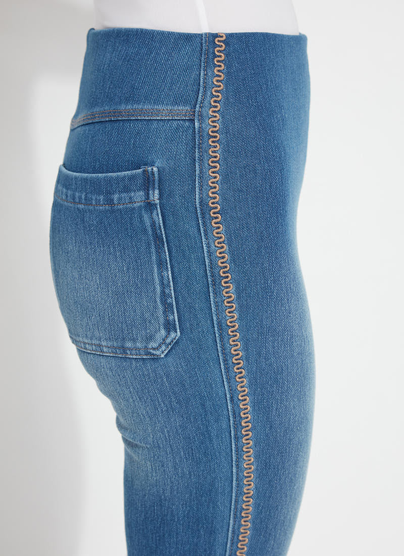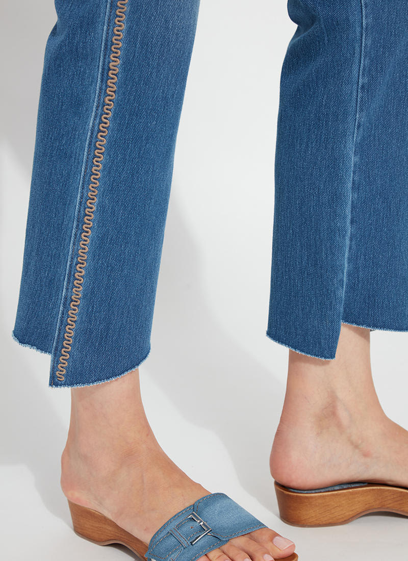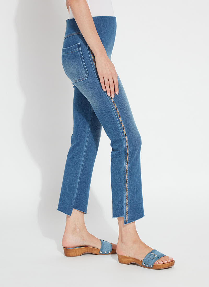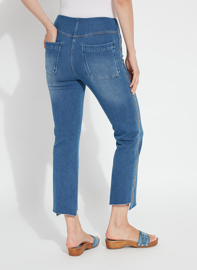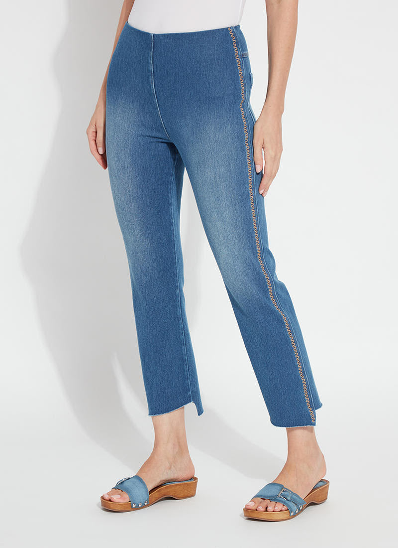 Introducing Kenny Ankel Baby Boot pants, made with a 360° smoothing waistband and 4-way stretch Knit Denim for a comfortable fit. These quirky jeans feature square back patch pockets, a stepped raw-edge hem, and playful embroidery on the sides (Easily flatters hips and thighs! Goes great with nude sandals!)