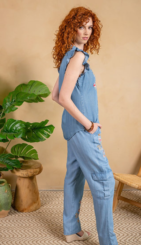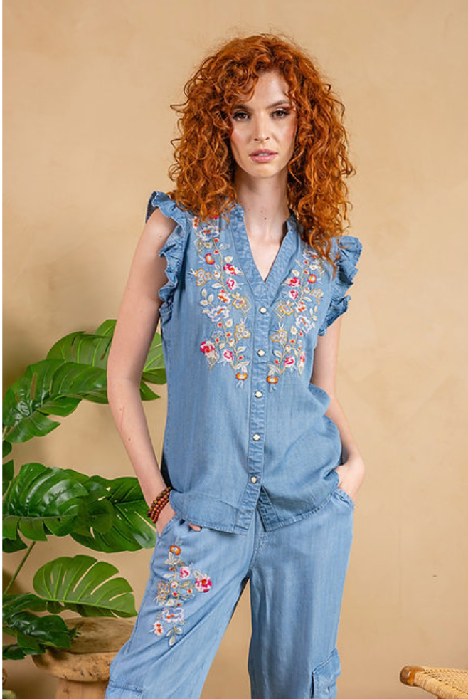 Let our Tencel denim top take you on a journey of comfort and style. Its V-neck and snap front add a chic touch while the flutter cap sleeves and rounded hem create a feminine silhouette. Featuring delicate floral embroidery, this top embraces your versatile and playful side. Transform your look today!