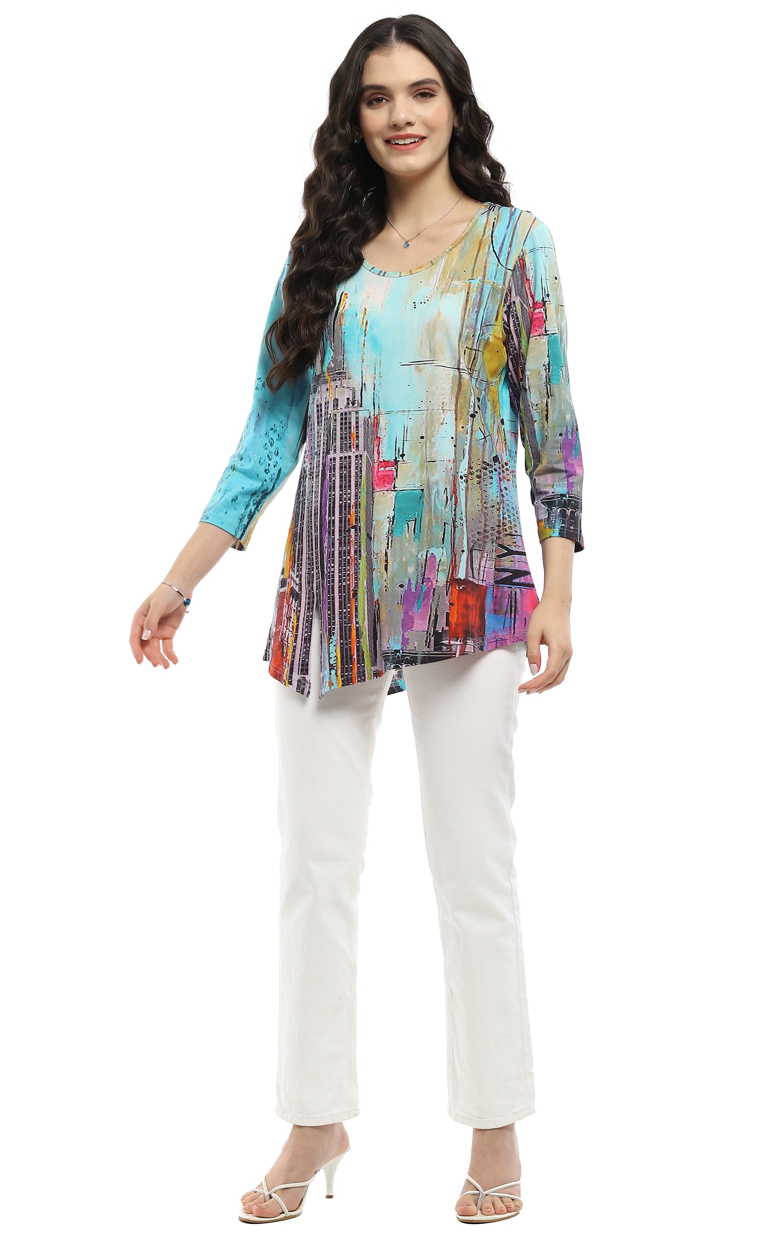 Stand out as the most fashion-forward urbanite in the Chicago Asymmetrical Tunic! With its unique hemline, versatile 3/4 sleeves, and avant-garde cityscape design, you'll exude effortless style and be prepared to conquer the bustling city streets. Dress it up or down for a playful and unconventional look.