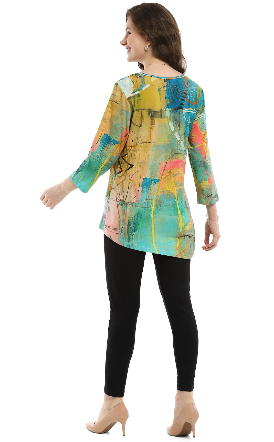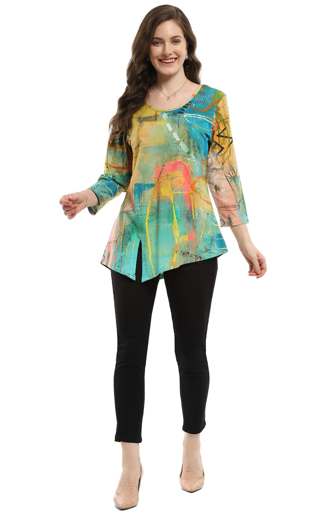 Introducing the Greeley Asymmetrical Tunic by Parsley and Sage. This elegant piece, made from 96% cotton and 4% spandex-knit, features a striking graphic pattern that is sure to turn heads. A versatile addition to your wardrobe, pair it with any bottoms for a sophisticated and stylish look.