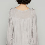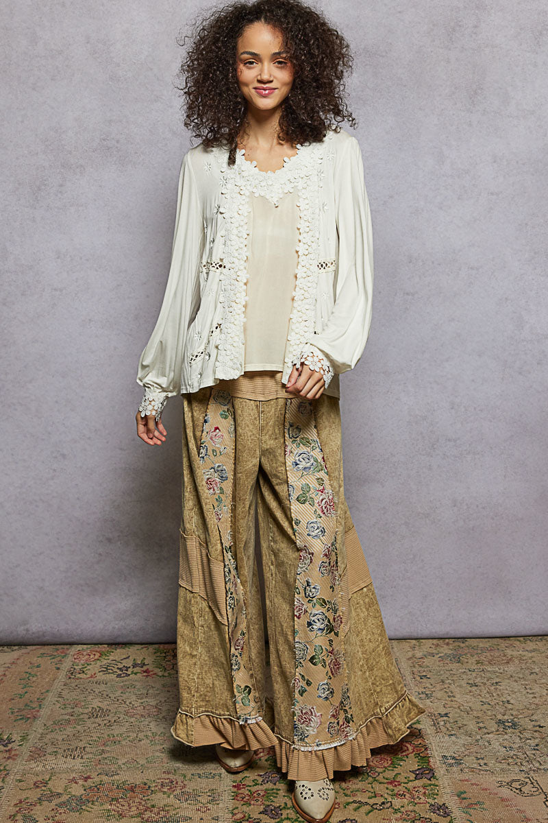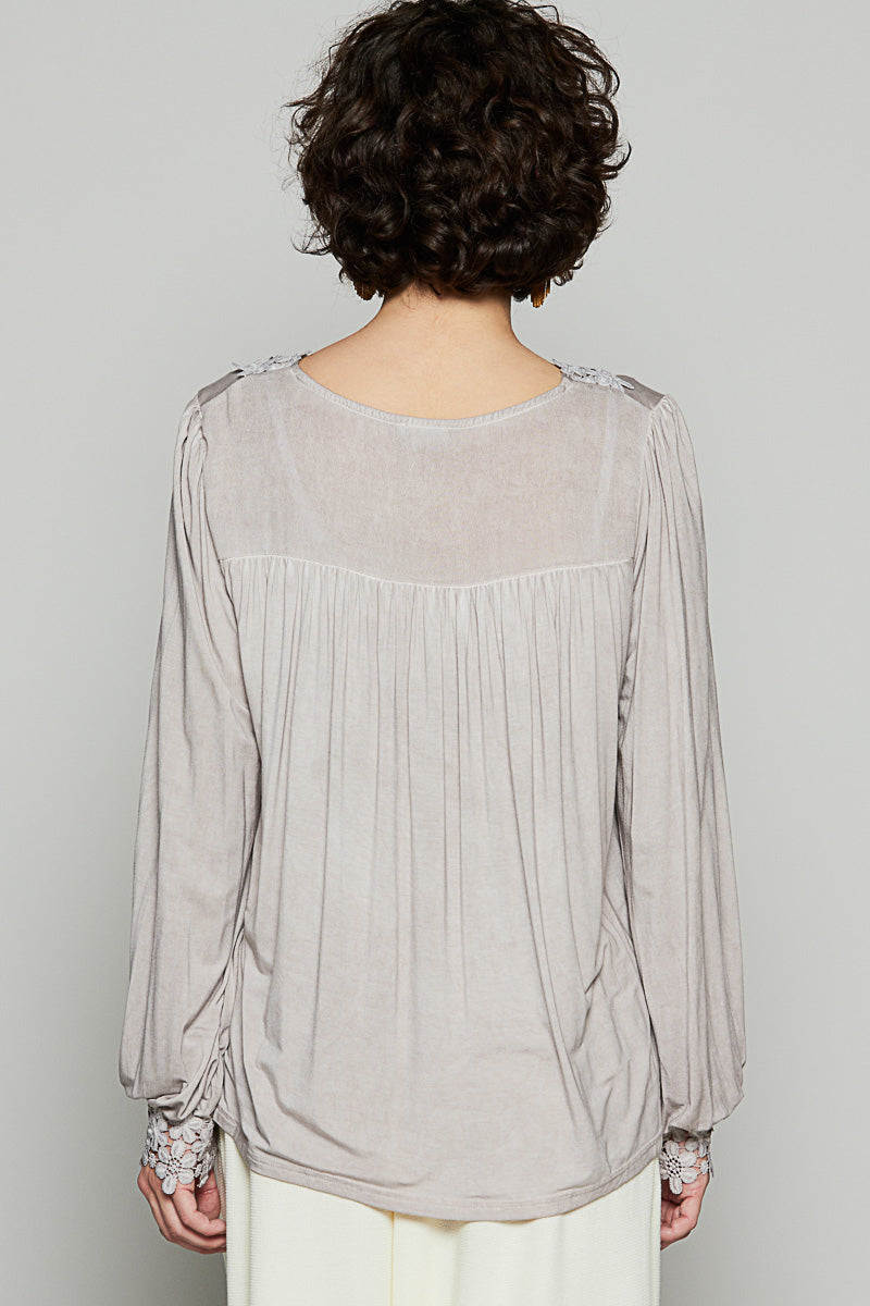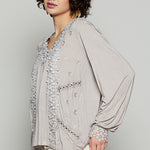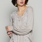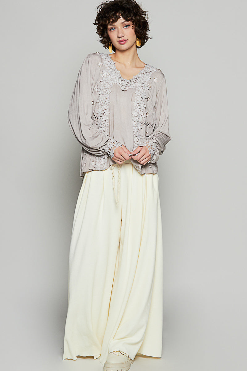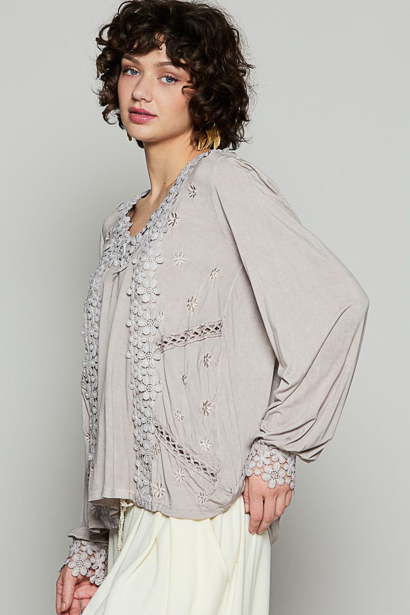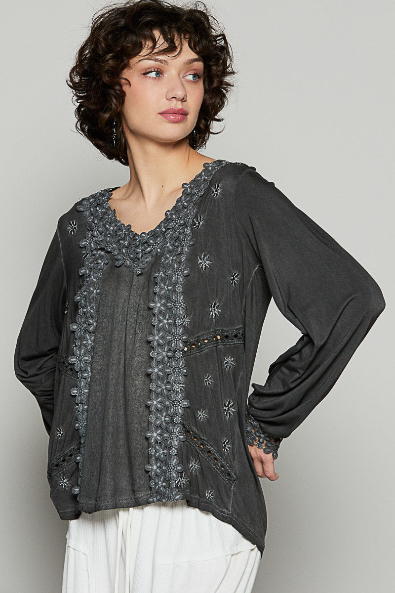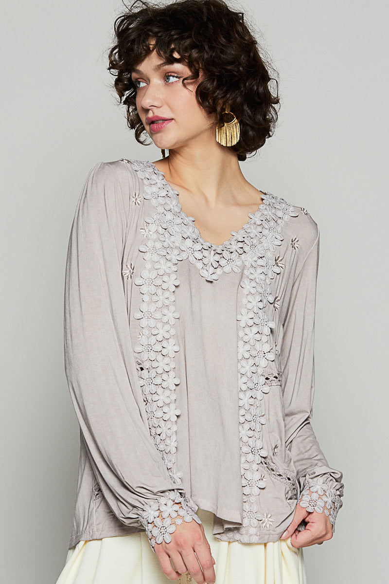 Experience effortless charm with our Feminine Floral Embroidery Woven Top. Its relaxed fit and delicate floral lace at the low V neckline highlight your playful side, while intricate side floral embroidery adds a touch of whimsy. The see-through lace shirring on the back offers both breathability and a roomy feel. Finished with scalloped floral-trimmed shirred long sleeves and side button closures, this top blends comfort and flirty detail perfectly. Crafted from soft, stretchy rayon and spandex for a flattering, easy fit all day long.
