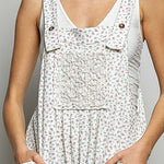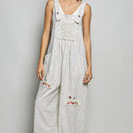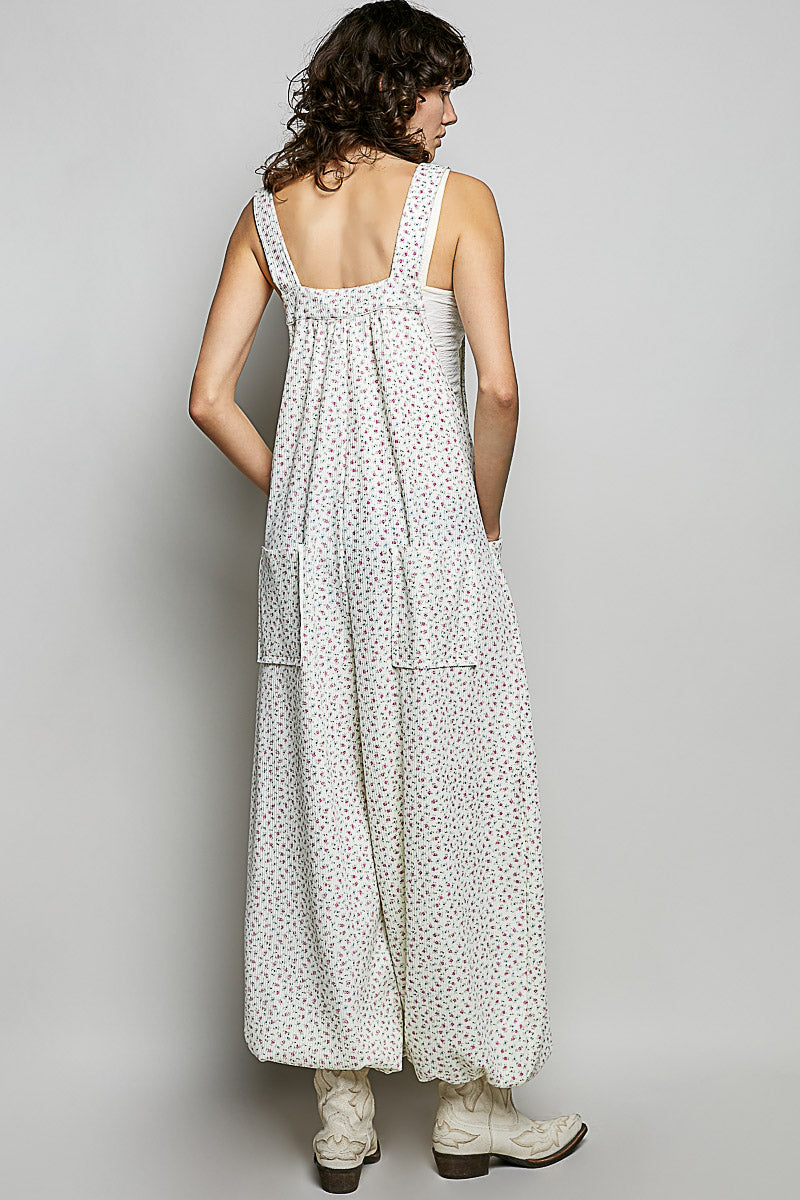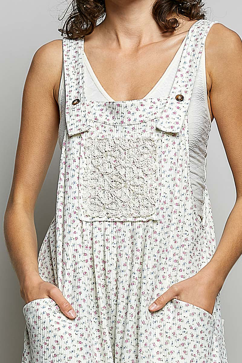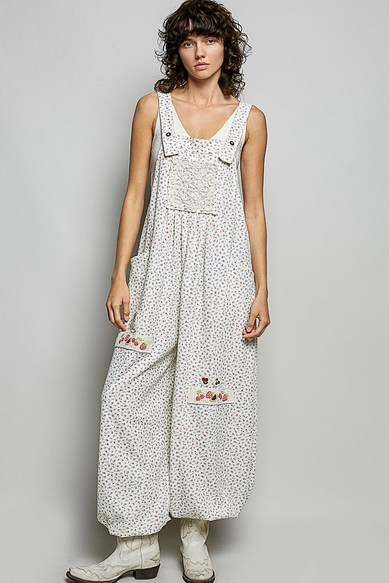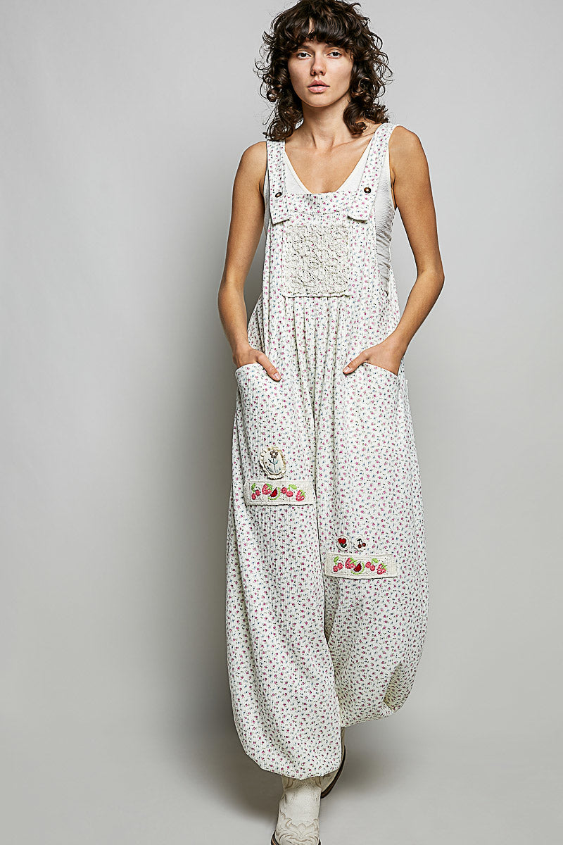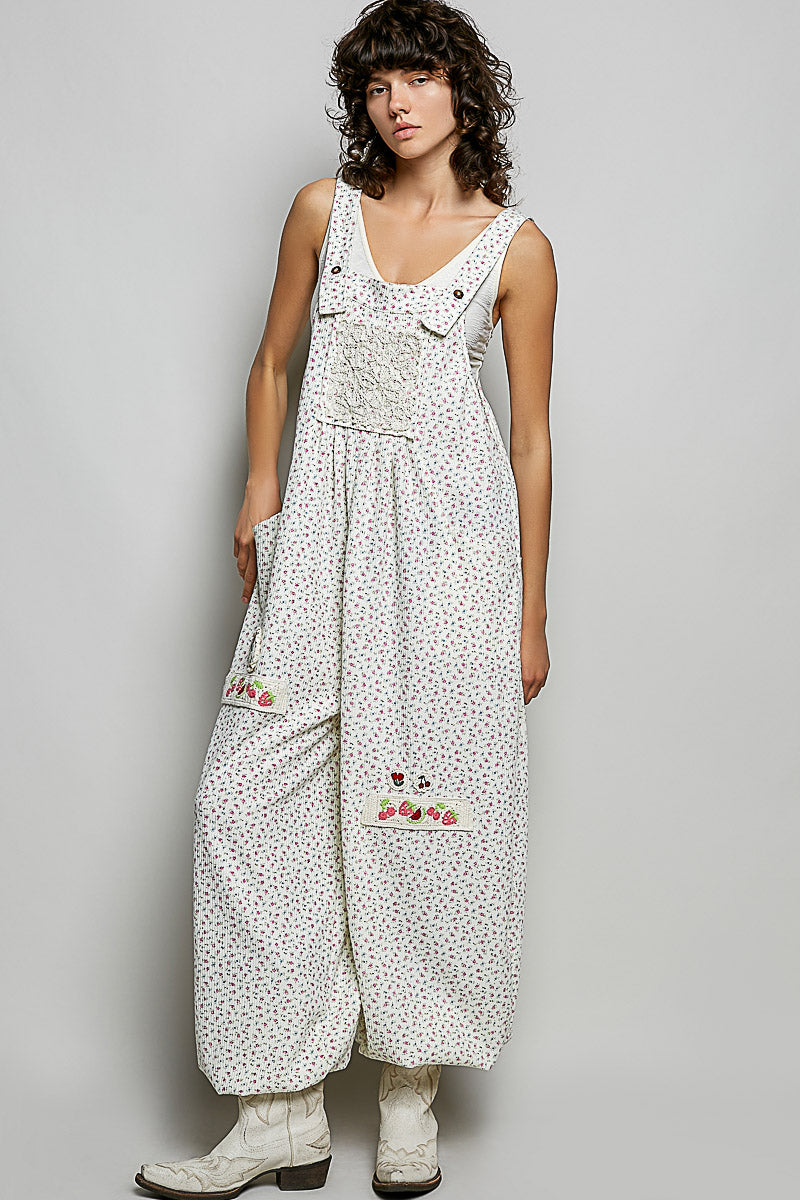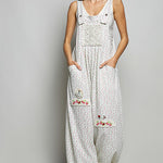 Embrace effortless comfort with these jogger-style overall pants, crafted from a soft printed knit blend. The relaxed silhouette features contrast front pockets, outseam construction, and subtle shirring accents that enhance movement and fit. Finished with a vintage wash and charming floral pattern, they're ideal for lounging, casual outings, or laid-back street style.