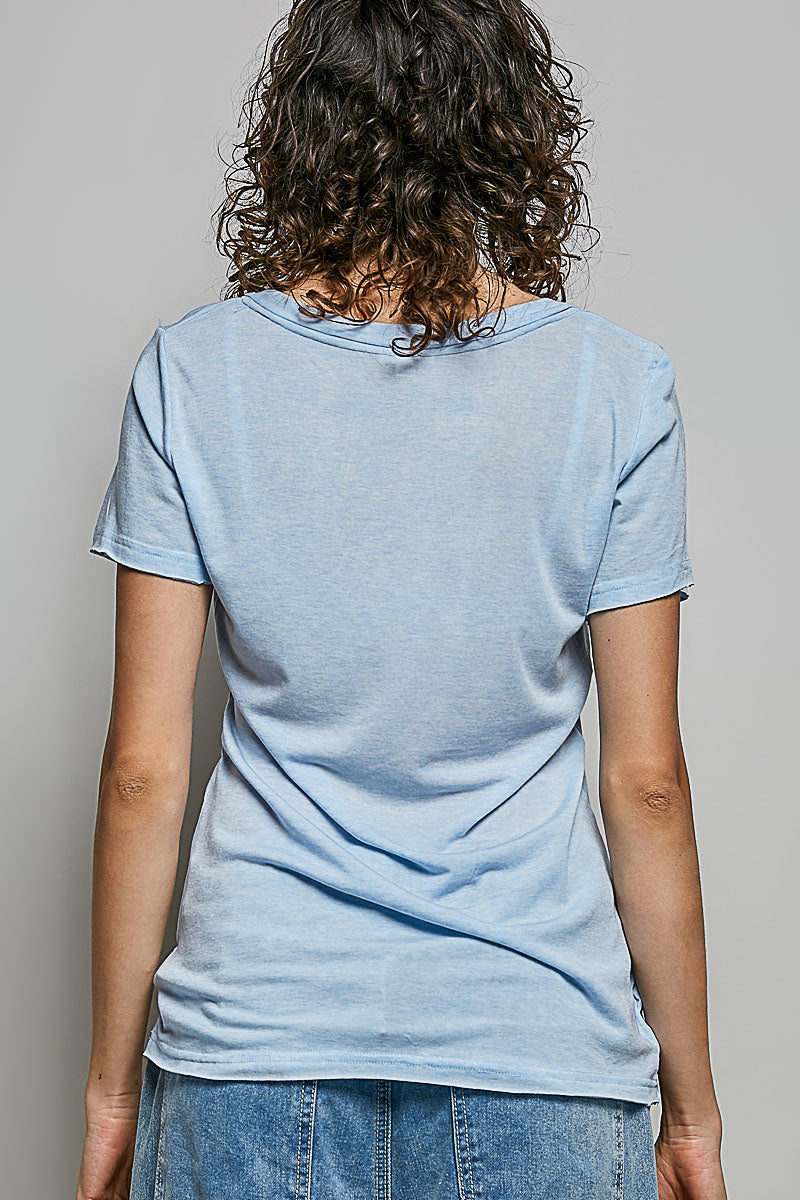 Designed in a V-neck short sleeve regular fit, this top features POL's signature jersey fabric—celebrated for its ultra-soft texture and lightweight comfort. Vintage stone washing creates a naturally worn-in look that adds effortless character to any outfit.