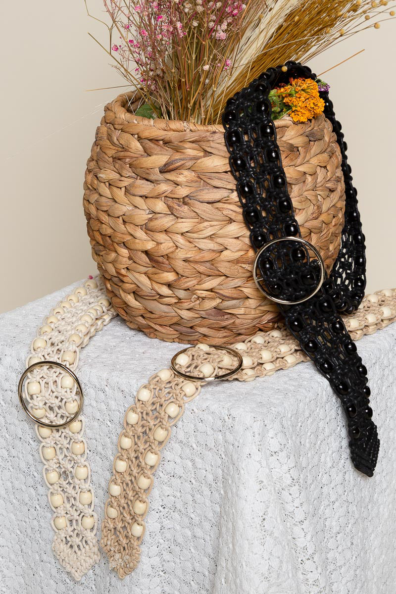 Indulge in the artistry of our Macrame Belt. The supple leatherette blends with intricate string knots, twisted with beads and secured by a silver buckle. Elevate any outfit with this luxurious and exclusive accessory. Made with 100% polyester for lasting quality.