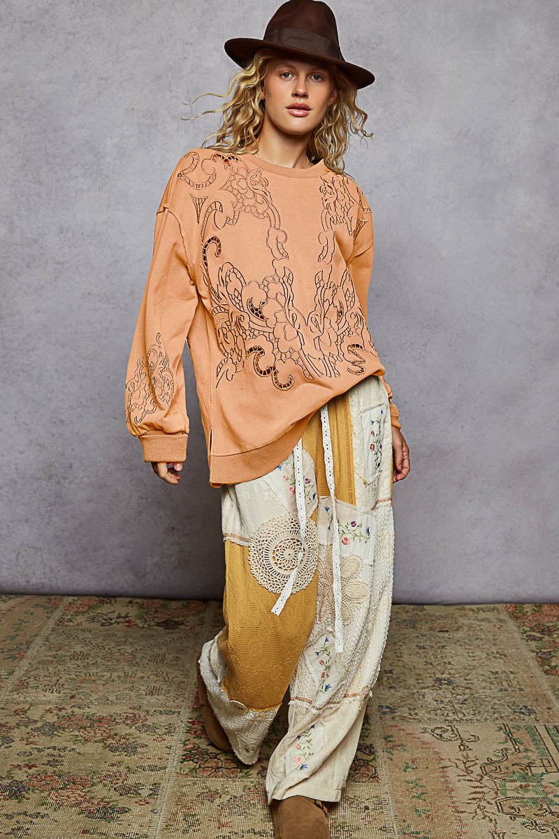 This playful Eyelet Pullover Sweatshirt features a cozy round neck and trendy balloon sleeves for a relaxed, comfy fit. Made from soft French terry fabric with 85% cotton and 15% polyester, it offers breathable warmth. The unique cut-out detail with a pointed solid pattern adds a fun twist, while the dried apricot color brings a fresh, cheerful vibe to your casual wardrobe. Perfect for adding a splash of personality to your everyday look!