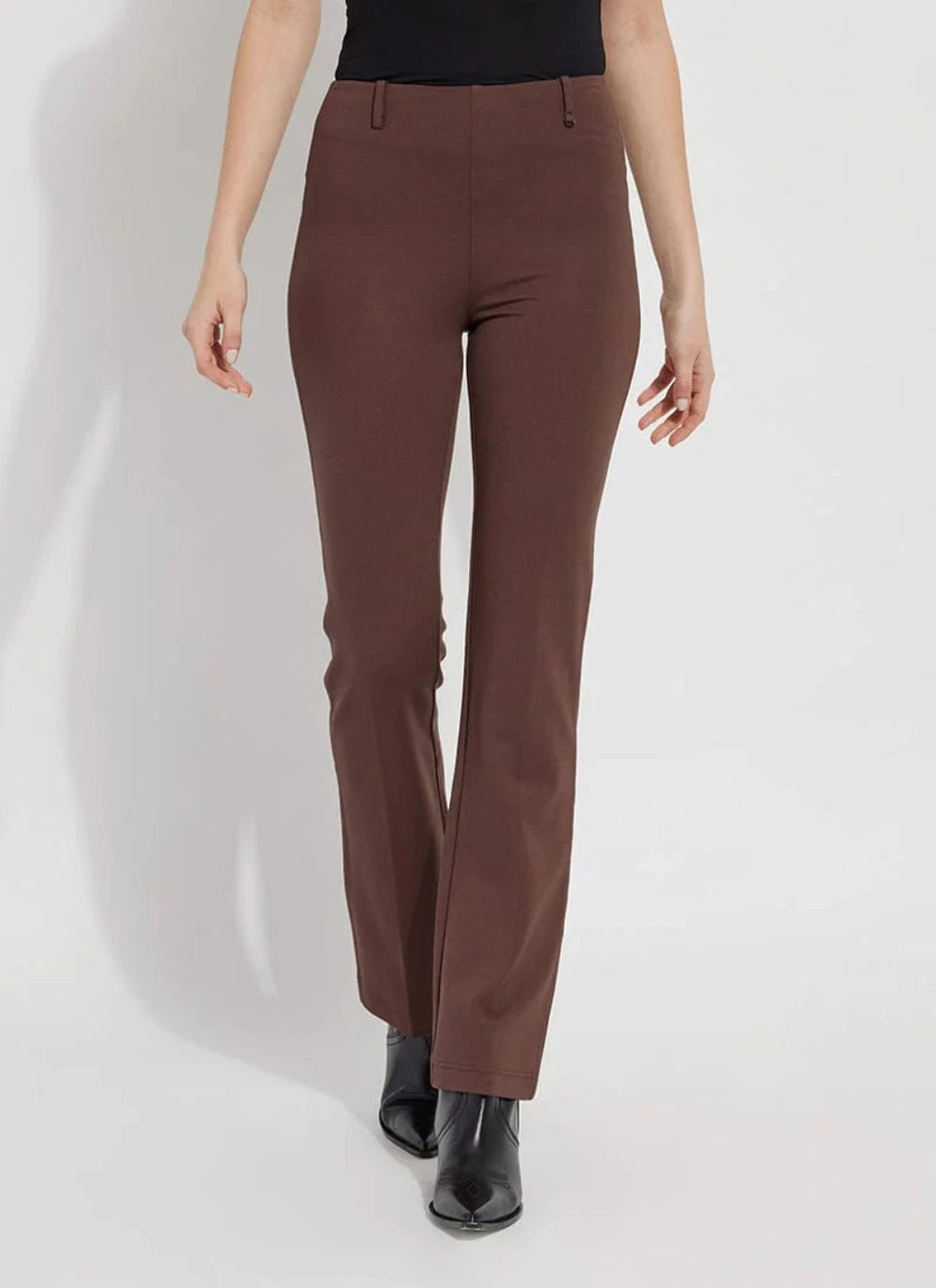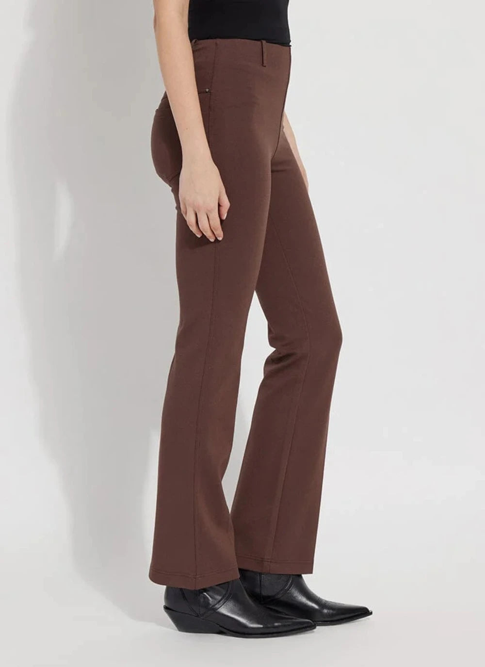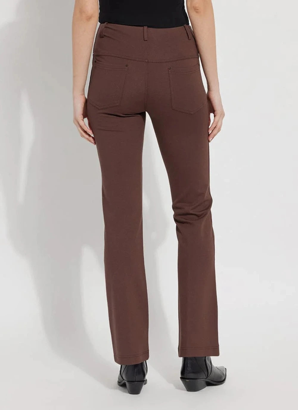 Strut your stuff in these slimming pants that skim the hips and thighs before falling into an open bootcut leg perfect for work or play. Made from 4-way stretch Ponte, this gorgeous pant offers pull-on styling, a concealed patented waistband, studded back pockets, belt loops for added versatility and all-day support, shaping and resiliency.