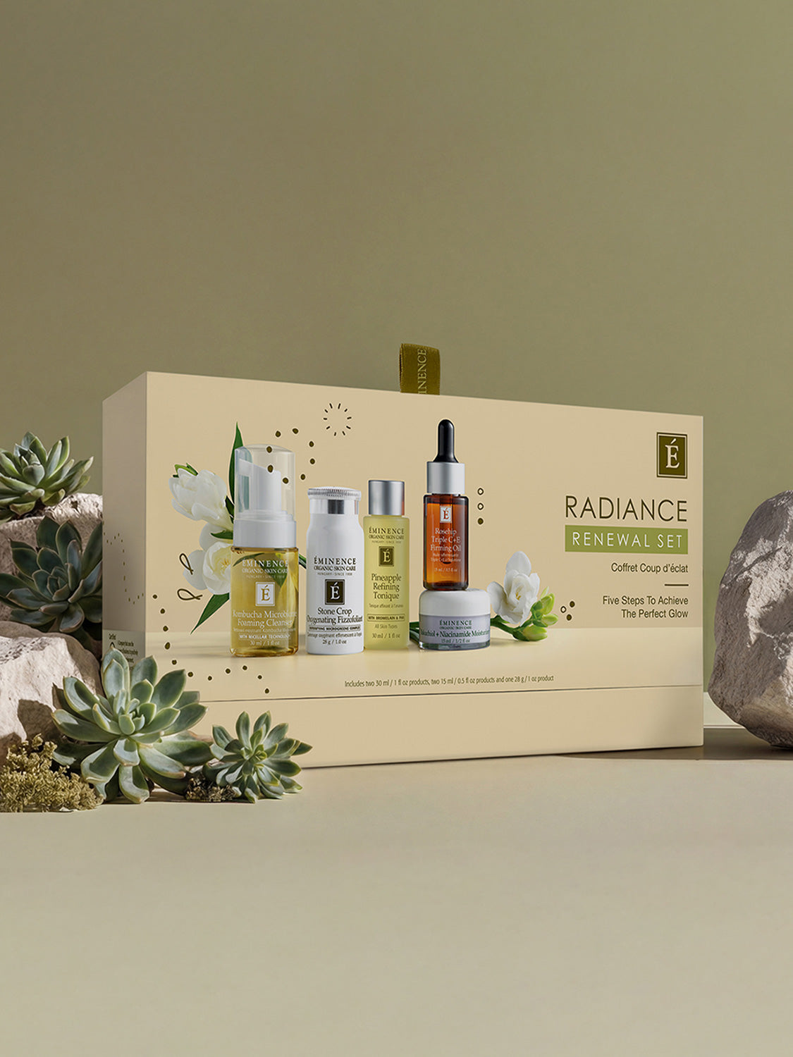 Glow up, glow on! Our bestselling Radiance Renewal Set brings the spa experience straight to your skincare routine with five award-winning Eminence essentials in perfectly portable sizes. From the Kombucha Microbiome Foaming Cleanser to the luxe Rosehip Triple C+E Firming Oil, this curated collection transforms your skin with innovative, radiance-boosting formulas—whether you're at home or jet-setting across the globe. Vegan, nut-free, and gluten-free. Your skin's glow-up starts here!
