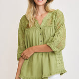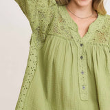 This Lace Detailed Henley Top is crafted from soft, breathable 100% cotton gauze, perfect for a light and airy feel. Featuring charming lace accents and a relaxed fit, it adds a playful touch to your casual wardrobe. Unlined for extra comfort, this top pairs effortlessly with your favorite jeans or skirts for a breezy, stylish look. Modeled here in size small on a 5'8" frame, it’s designed to keep you feeling cool and looking cute all day long.